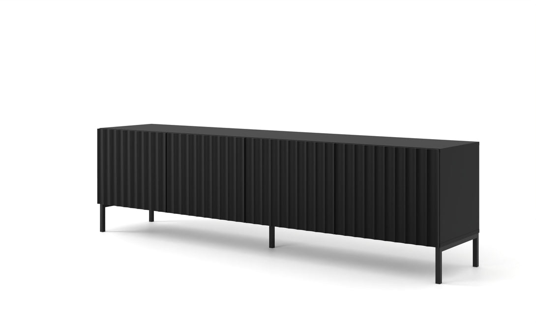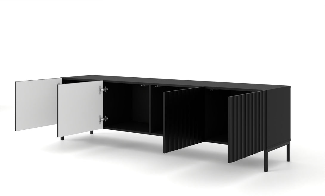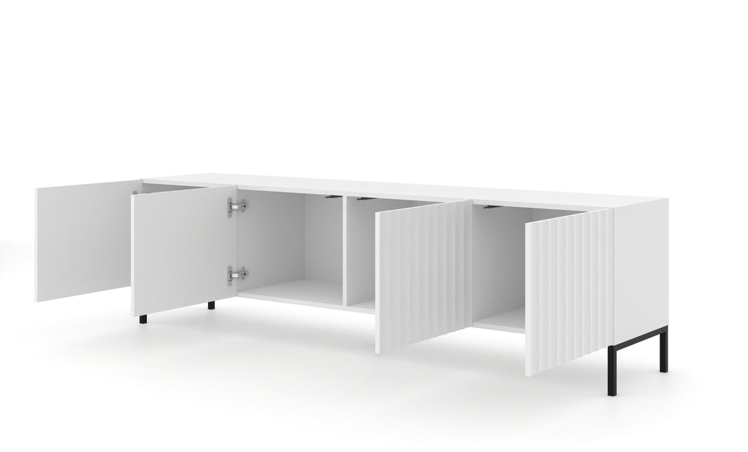 Mit einer Breite von 200 cm bietet das Lowboard großzügigen Stauraum hinter vier Türen, ideal zur Aufbewahrung von Technik, Medienzubehör oder Dekoration. Die stabile Konstruktion aus MDF und laminierter Spanplatte sorgt für Langlebigkeit, während die matte weiße Oberfläche einen edlen Charakter unterstreicht.