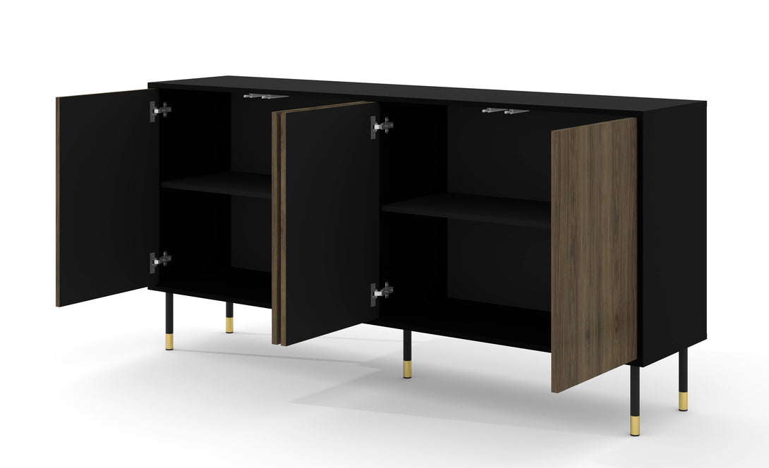Die WOODY Kommode vereint elegantes Design mit funktionalem Stauraum und verleiht jedem Raum eine stilvolle Note. Die aufwendig gefrästen Fronten im Dreiecksdesign setzen dekorative Akzente, während die gold-schwarzen Metallfüße dem Möbelstück eine moderne Ausstrahlung verleihen. Die Kombination aus mattschwarzem Korpus und Fronten in Pacific Nuss sorgt für eine warme und gleichzeitig edle Optik.