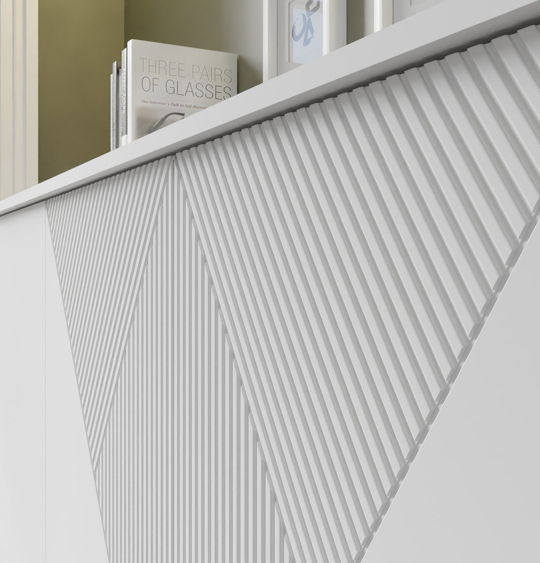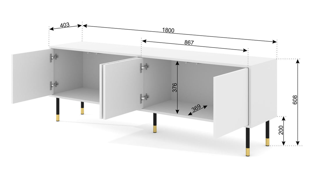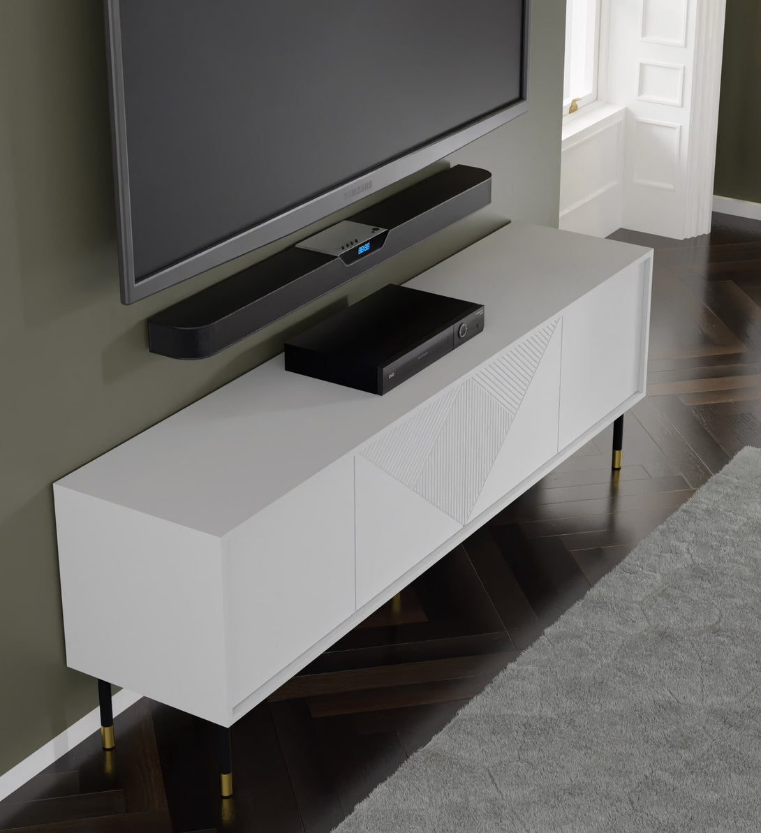 Der WOODY TV-Schrank überzeugt durch sein modernes Design, das Eleganz und Funktionalität auf stilvolle Weise verbindet. Die dezent gefrästen Fronten mit dreieckigem Muster verleihen dem Möbelstück eine raffinierte Optik, während die schwarz-goldenen Metallbeine für einen trendigen Akzent sorgen. Die grifflose Ausführung mit PUSH TO OPEN Mechanismus unterstreicht das minimalistische Konzept des Designs.