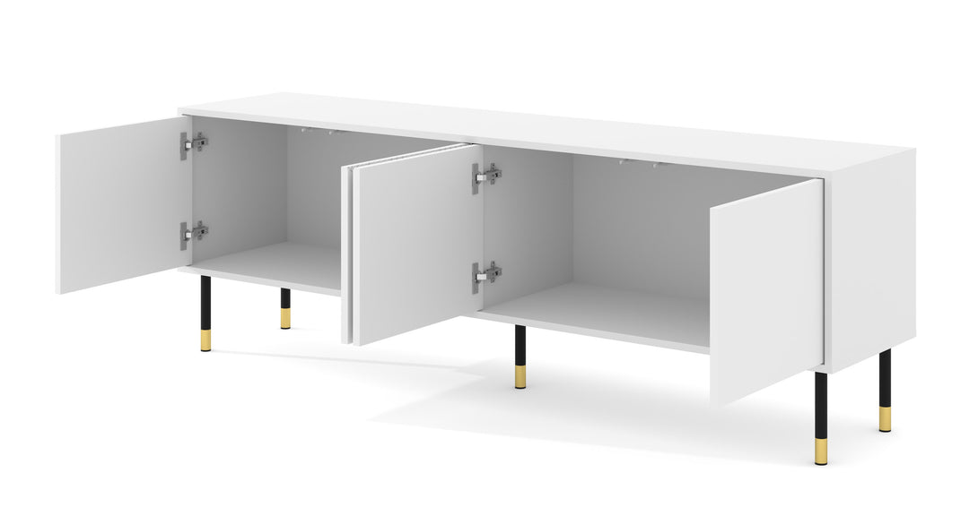 Mit vier Türen bietet das Lowboard großzügigen Stauraum für Multimedia-Geräte, Kabel und Zubehör. Die breite Ablagefläche eignet sich perfekt für Fernseher, Spielkonsolen oder Dekorationselemente. Der TV-Schrank fügt sich harmonisch in moderne Wohnräume ein und ist ein Highlight jeder Einrichtung.
