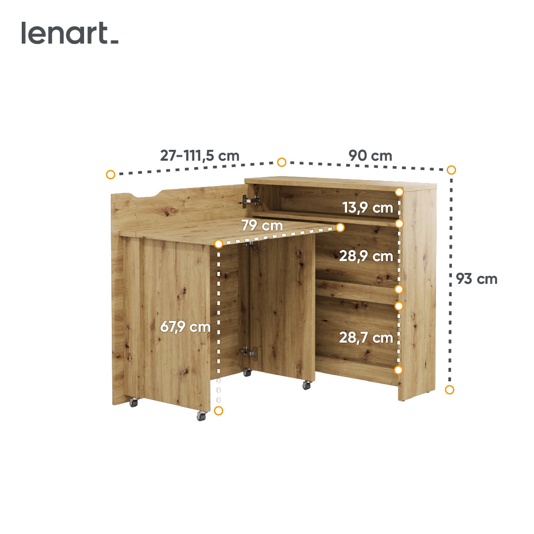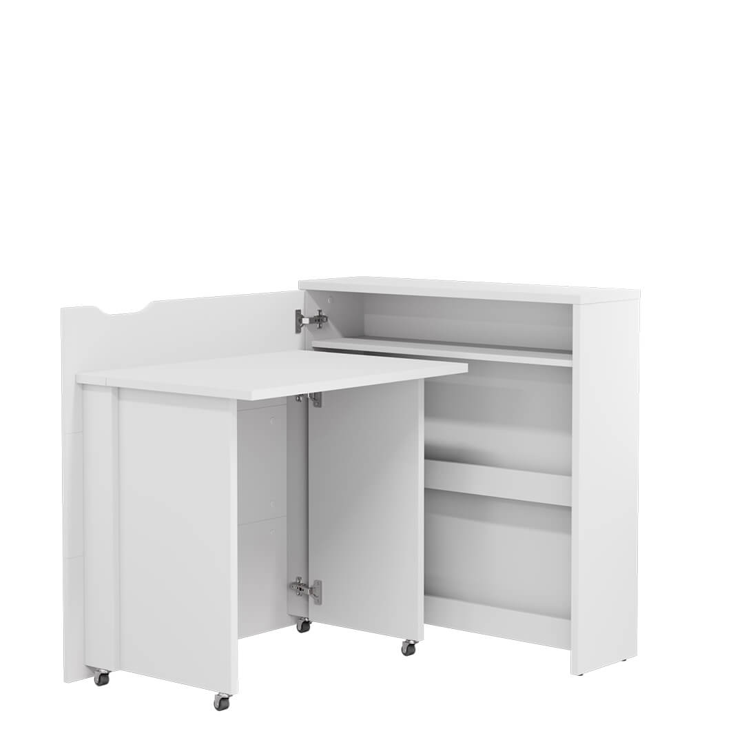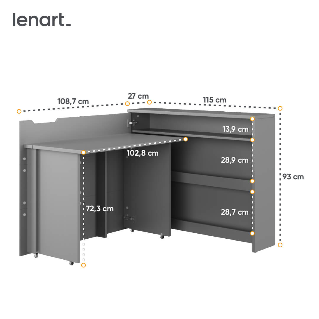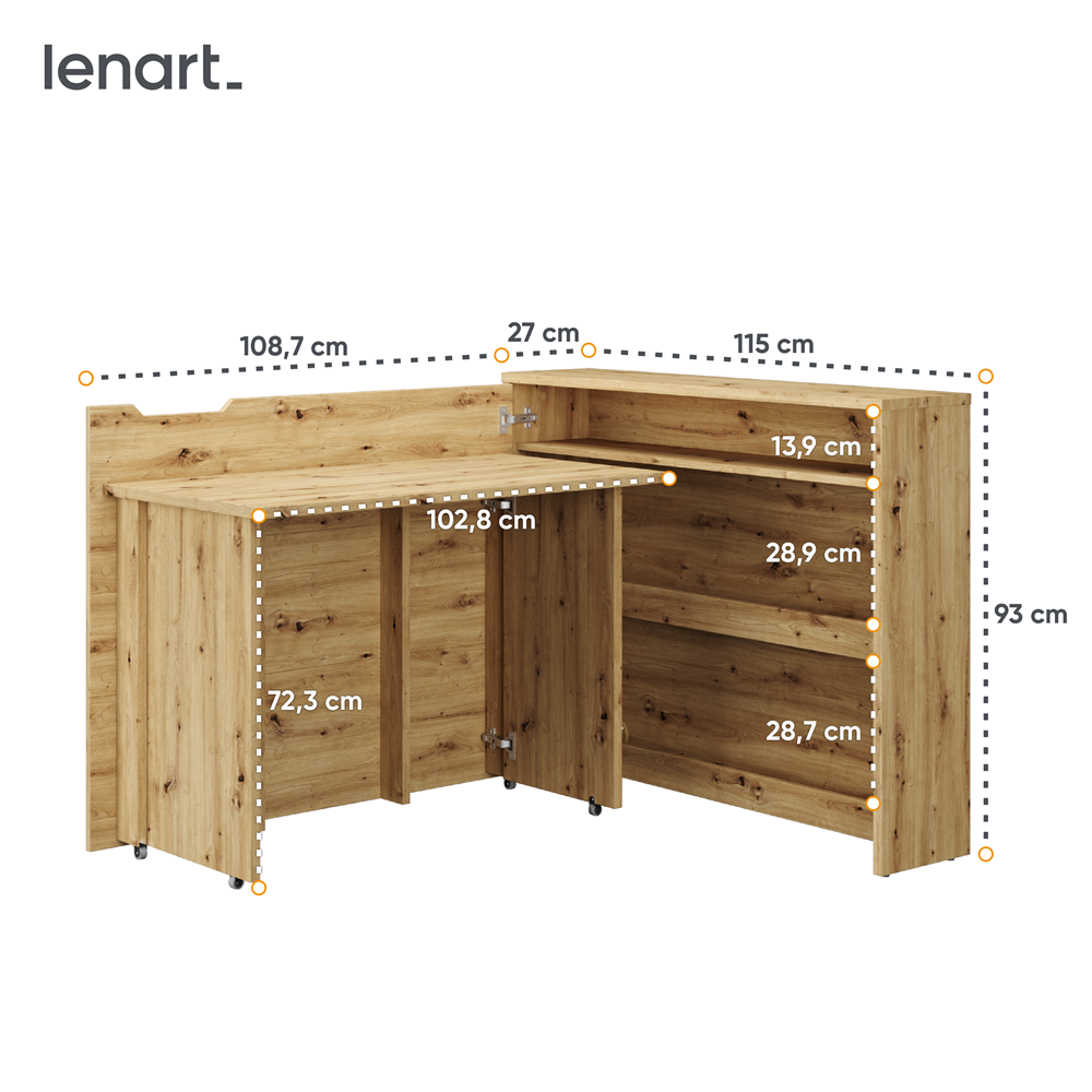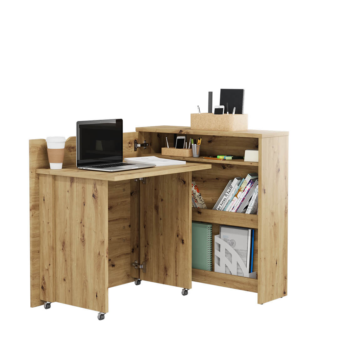 Der WORK CONCEPT Schreibtisch bietet eine clevere Lösung für kleine Räume, Homeoffices oder Jugendzimmer. Durch sein durchdachtes Klappsystem lässt sich der Tisch im Handumdrehen in eine praktische Kommode verwandeln, deren Oberfläche dekorativ genutzt werden kann. Dank der integrierten Rollen ist das Ausklappen besonders einfach und schnell. Beim Aufklappen bietet das Möbelstück eine komfortable Arbeitsfläche sowie drei geräumige Regalfächer für Bücher, Dokumente oder Büroutensilien. Die Ausführung ist sowohl für Links- als auch Rechtshänder erhältlich und passt sich somit flexibel an Ihre Raumgegebenheiten an. Der Schreibtisch ist in zwei Größen erhältlich – 115 cm und 90 cm – und lässt sich somit perfekt an unterschiedliche Platzbedürfnisse anpassen.