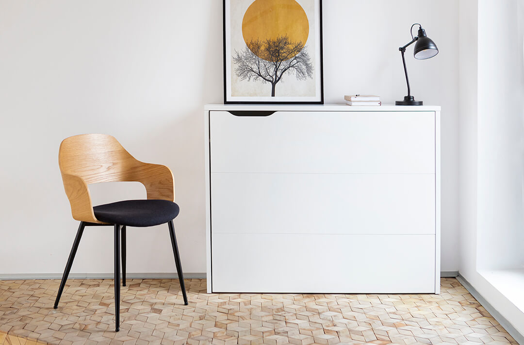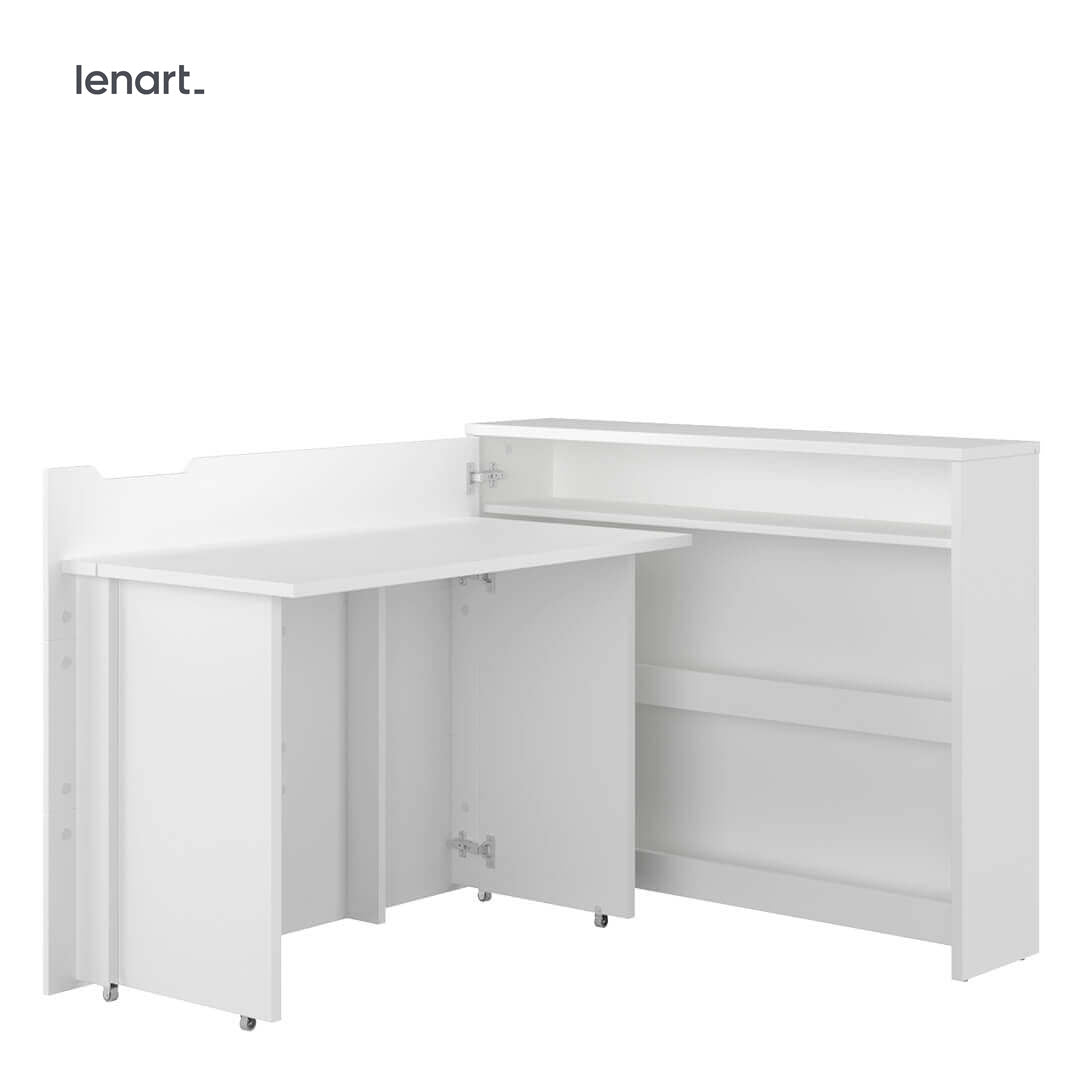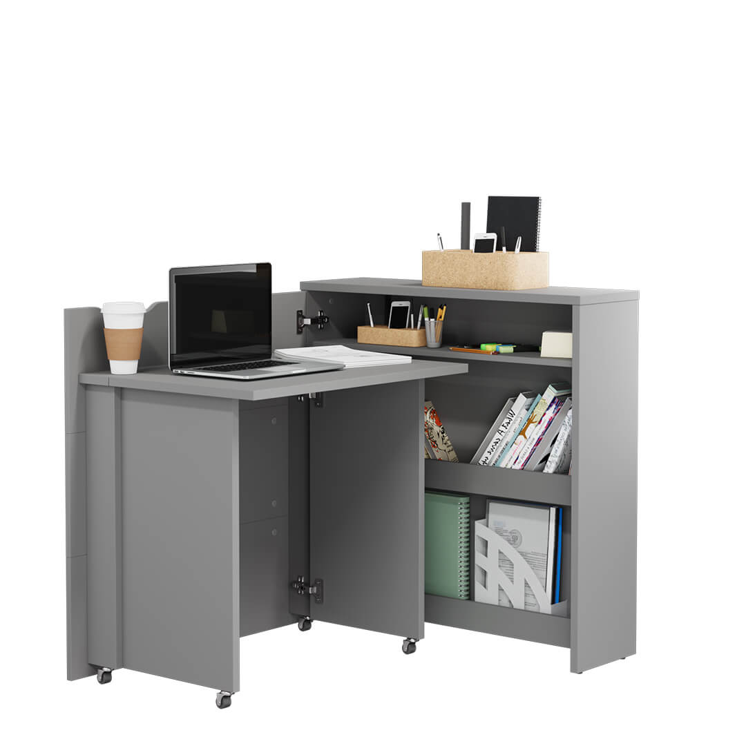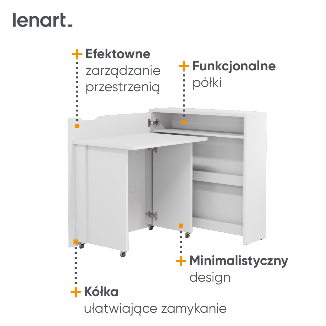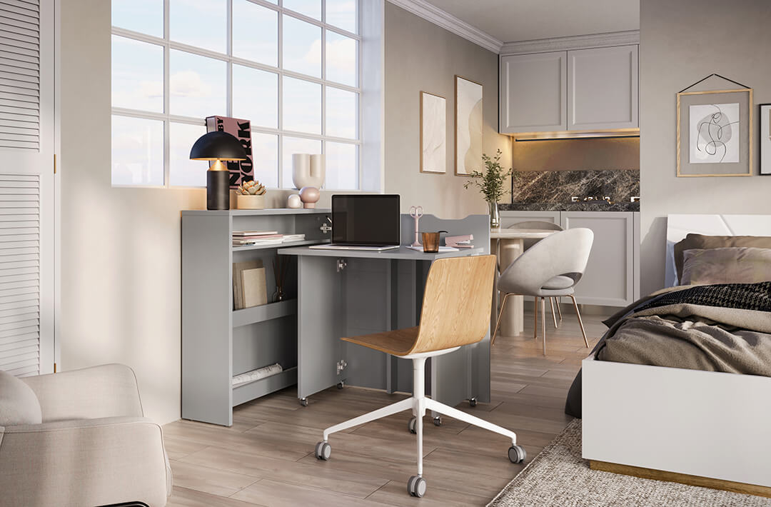 Der WORK CONCEPT Schreibtisch bietet eine clevere Lösung für kleine Räume, Homeoffices oder Jugendzimmer. Durch sein durchdachtes Klappsystem lässt sich der Tisch im Handumdrehen in eine praktische Kommode verwandeln, deren Oberfläche dekorativ genutzt werden kann. Dank der integrierten Rollen ist das Ausklappen besonders einfach und schnell. Beim Aufklappen bietet das Möbelstück eine komfortable Arbeitsfläche sowie drei geräumige Regalfächer für Bücher, Dokumente oder Büroutensilien. Die Ausführung ist sowohl für Links- als auch Rechtshänder erhältlich und passt sich somit flexibel an Ihre Raumgegebenheiten an. Der Schreibtisch ist in zwei Größen erhältlich – 115 cm und 90 cm – und lässt sich somit perfekt an unterschiedliche Platzbedürfnisse anpassen.