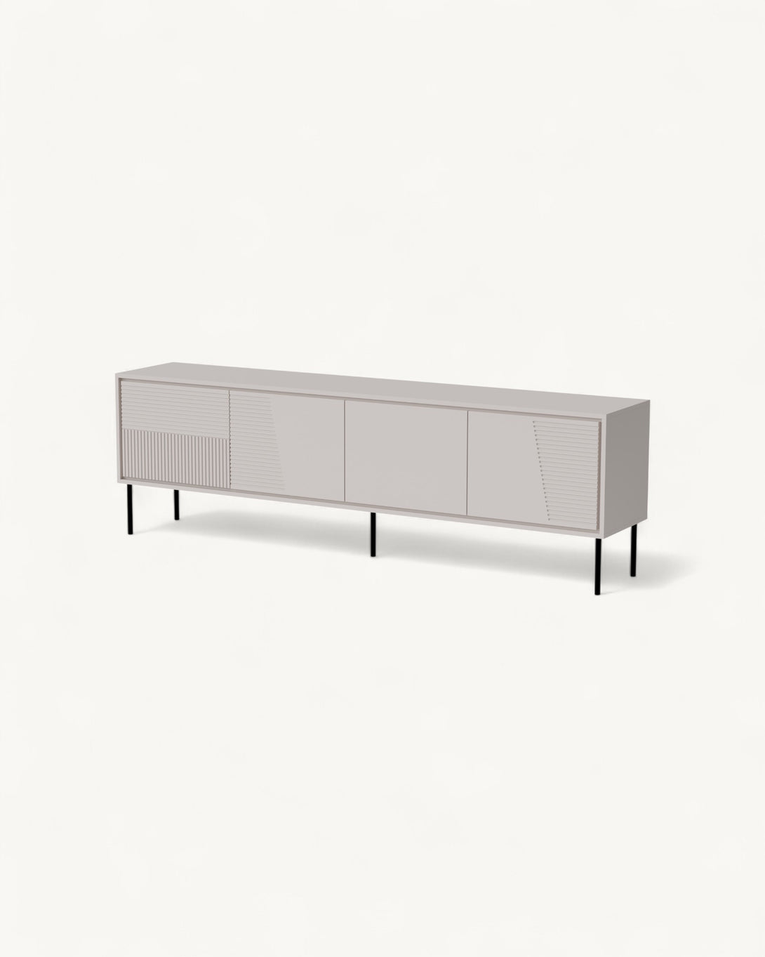 Das ABUDABI TV Möbel überzeugt durch seine moderne Linienführung, klare Struktur und die Kombination aus mattem Weiß und kontrastierenden schwarzen Metallfüßen. Mit einer Breite von 200 cm bietet dieses Lowboard großzügigen Stauraum und setzt gleichzeitig stilvolle Akzente in Ihrem Wohnzimmer.