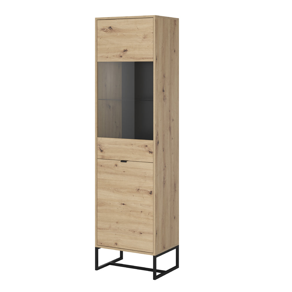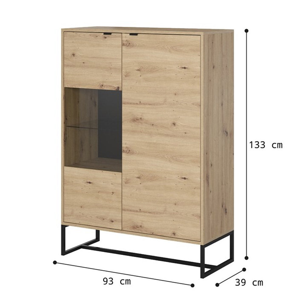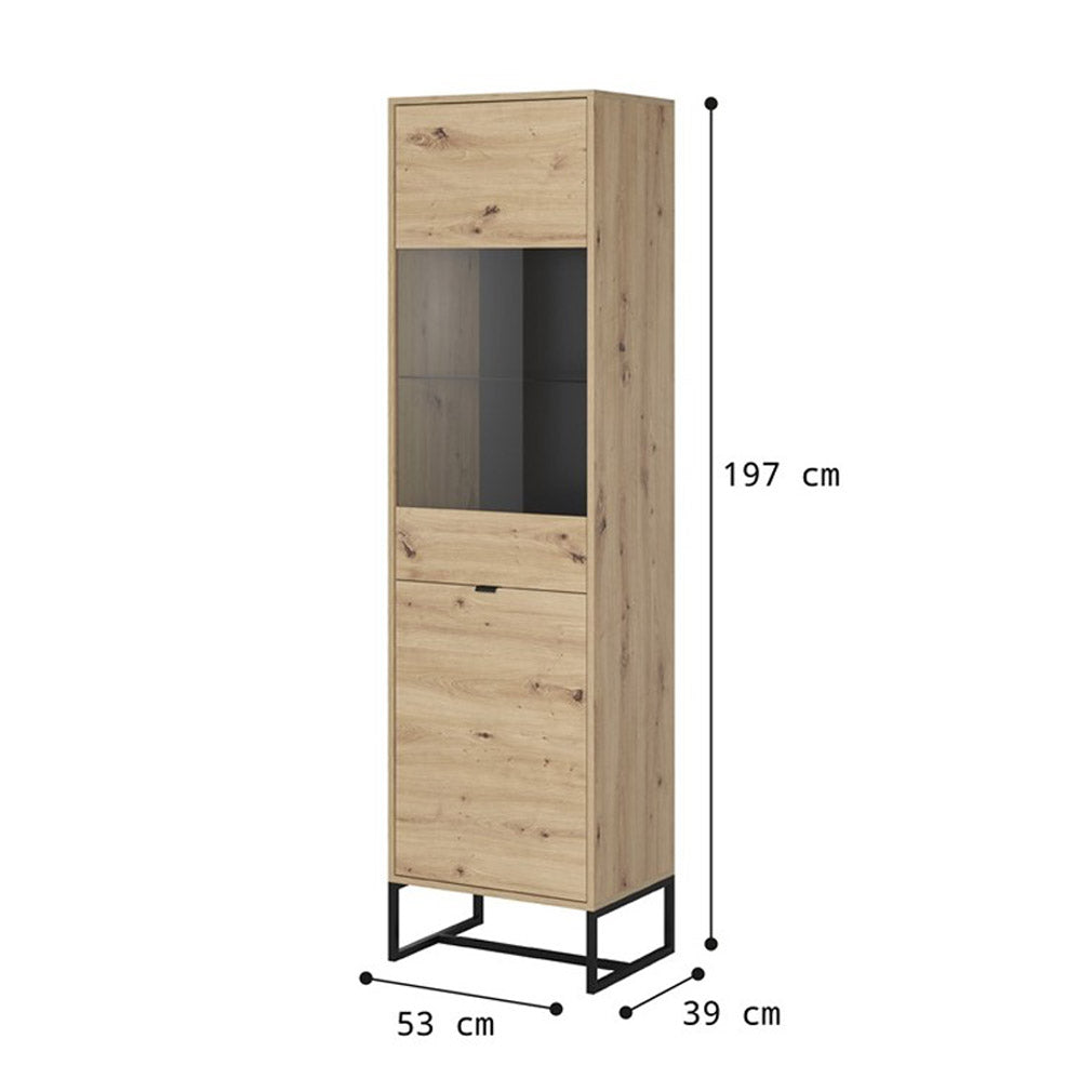 Die AMBER I Vitrine überzeugt durch ihr modernes Design in Artisan Eiche und bietet eine elegante Präsentationsfläche für Deko, Bücher oder Geschirr. Die Kombination aus Holzoptik und schwarzen Metallfüßen verleiht dem Möbelstück einen zeitgemäßen Look und sorgt für hohe Stabilität.Mit ihren kompakten Maßen eignet sich die Vitrine ideal für kleinere Räume oder als Ergänzung zu bestehenden Einrichtungen. Hochwertige Materialien wie laminierte Platten mit ABS-Kanten sowie langlebige Metallgriffe runden das Gesamtbild ab.