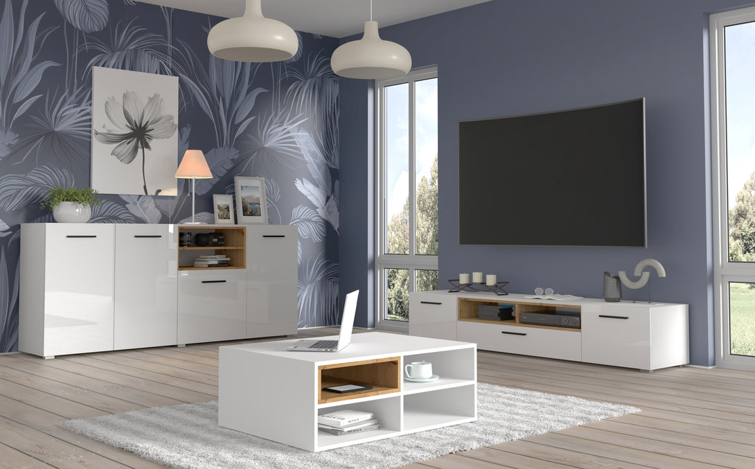 Der ANETTE M Couchtisch verbindet industriellen Charme mit moderner Eleganz und passt sich mühelos verschiedenen Einrichtungsstilen an. Die Kombination aus mattem Weiß und einem eleganten Einsatz in Artisan-Eiche schafft ein stilvolles und funktionales Möbelstück für Ihr Wohnzimmer.Dank der durchdachten Konstruktion bietet der Tisch ausreichend Stauraum und ist robust verarbeitet, was ihn zu einem langlebigen Begleiter in Ihrem Zuhause macht.