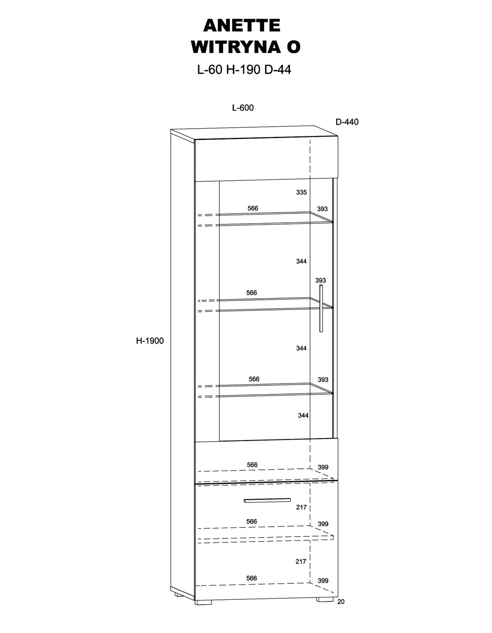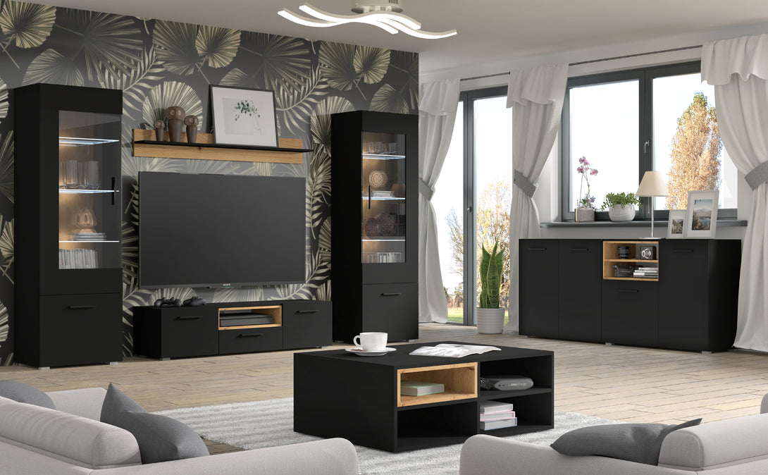 Der ANETTE Vitrinenschrank vereint industriellen Loft-Stil mit eleganten Glasflächen. Die Kombination aus schwarz matten Fronten und dem natürlichen Artisan Eiche-Dekor schafft einen modernen Blickfang für Ihre Wohnräume.
