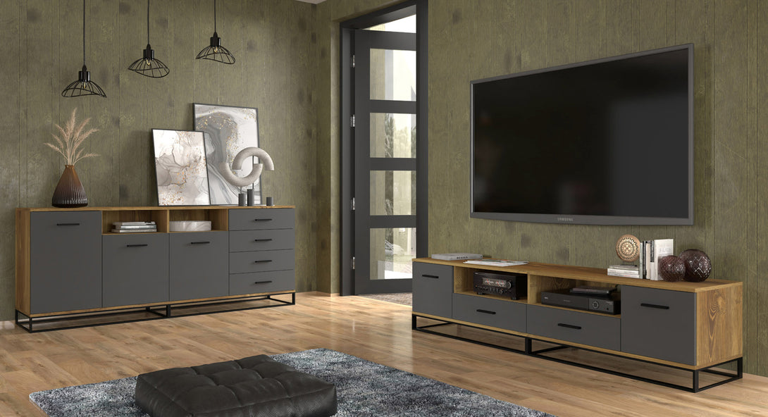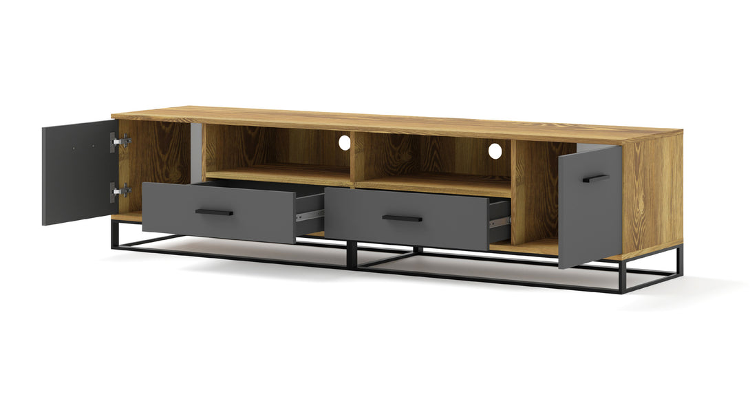 Das ARSEN TV-Lowboard verbindet moderne Industrieoptik mit praktischer Funktionalität. Die Kombination aus robuster laminierter Platte in Firewood-Optik und einem stabilen schwarzen Metallrahmen sorgt für eine stabile Basis für moderne Fernseher und Unterhaltungselektronik. Die beiden Schubladen, zwei geschlossene Fächer und zwei offene Regale mit Kabeldurchführungen bieten optimalen Stauraum und eine klare Organisation.