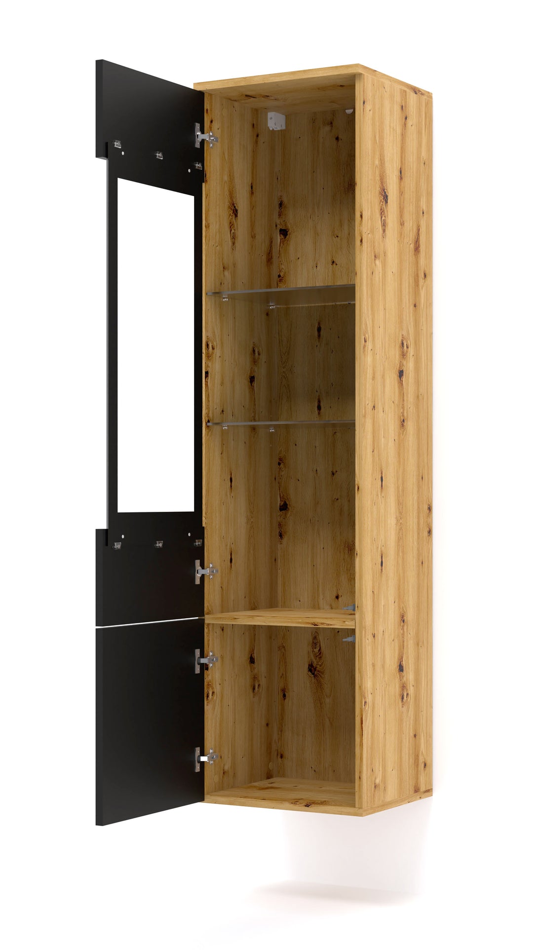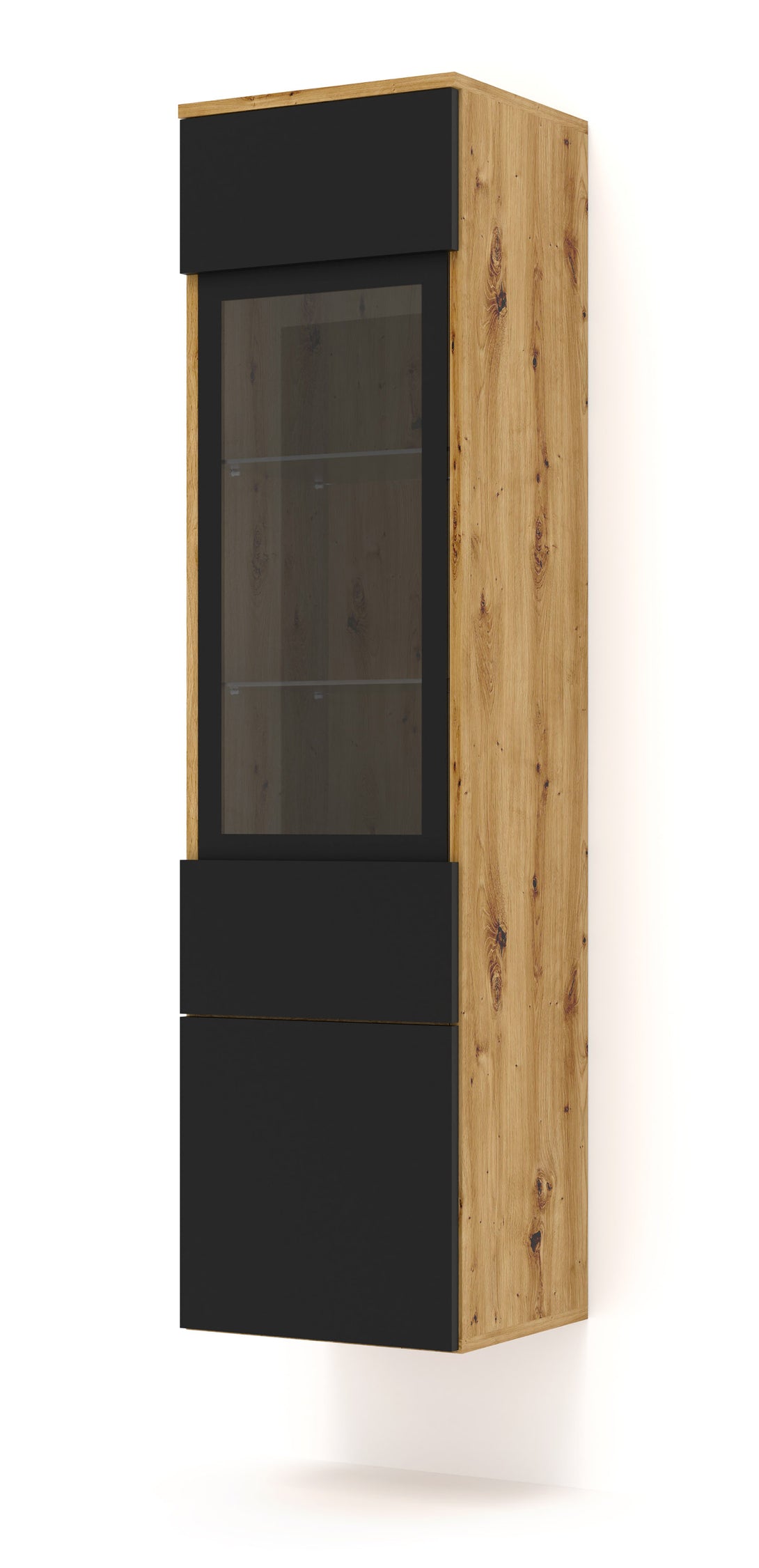 Die AURA Vitrine 1DS präsentiert sich in modernem Stil und kombiniert eine elegante Holzoptik mit schwarz matten Fronten sowie Glaselementen. Diese ansprechende Kombination wird zum Blickfang in jedem Wohnraum, sei es im Wohnzimmer oder im Esszimmer. Die schlicht gehaltene Form und die grifflose Optik verleihen dem Möbelstück eine zeitgemäße und einladende Ausstrahlung.