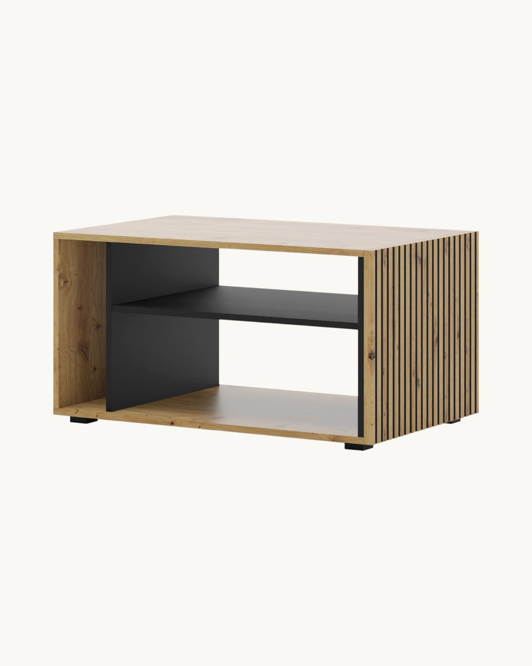 Der AURIS Couchtisch vereint modernes Design mit industriellem Flair und ist ein stilvoller Blickfang für jedes Wohnzimmer. Die Kombination aus natürlicher Holzoptik und schwarzer matter Front sorgt für ein elegantes Gesamtbild, während die gefrästen MDF-Leisten auf der Front für eine hochwertige Verarbeitung stehen.