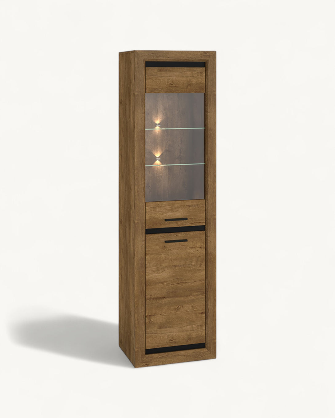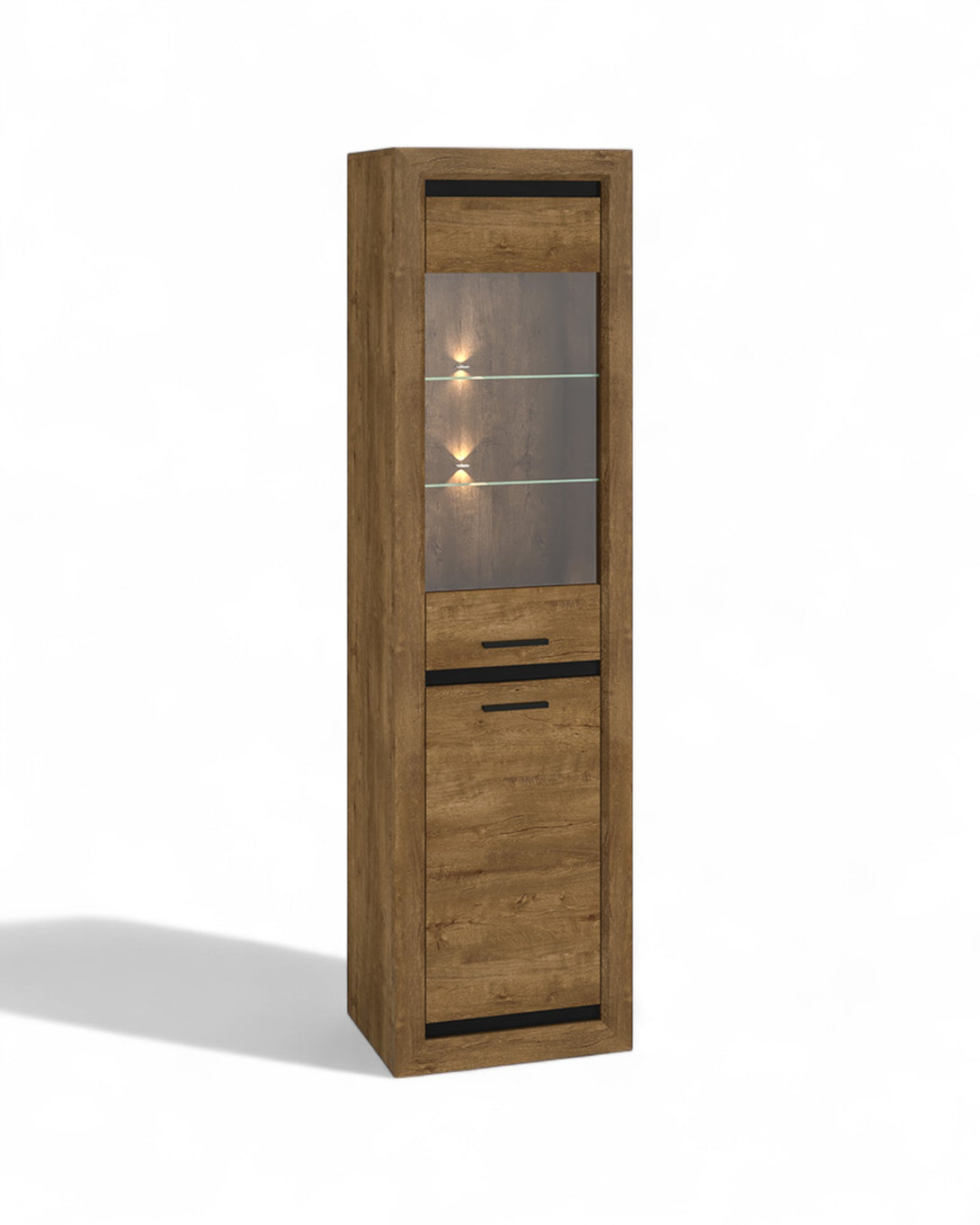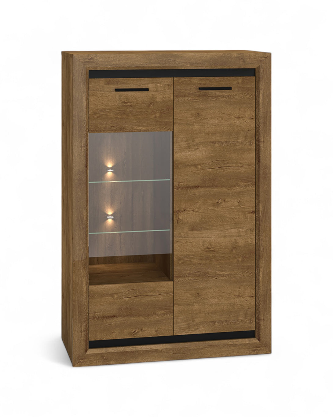 Die BALTICA Vitrine überzeugt mit einer eleganten Kombination aus natürlichem Dąb Lefkas-Dekor und schwarzen Akzenten, die dem Möbelstück einen modernen und markanten Charakter verleihen. Die hochwertige Verarbeitung mit laminierten Platten und robusten ABS-Kanten sorgt für Stabilität und Langlebigkeit im täglichen Gebrauch.Die integrierte Glasfläche ermöglicht eine stilvolle Präsentation Ihrer Lieblingsstücke, während die kompakte Form optimalen Stauraum bietet. Optional kann die Vitrine mit LED-Beleuchtung ergänzt werden, um eine atmosphärische Wirkung zu erzielen – ideal für Wohn- und Essbereiche mit Anspruch an Design und Funktionalität.