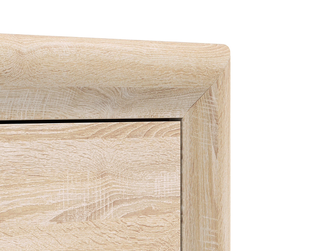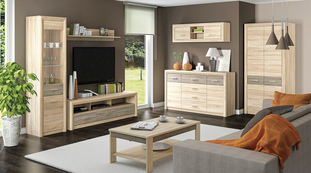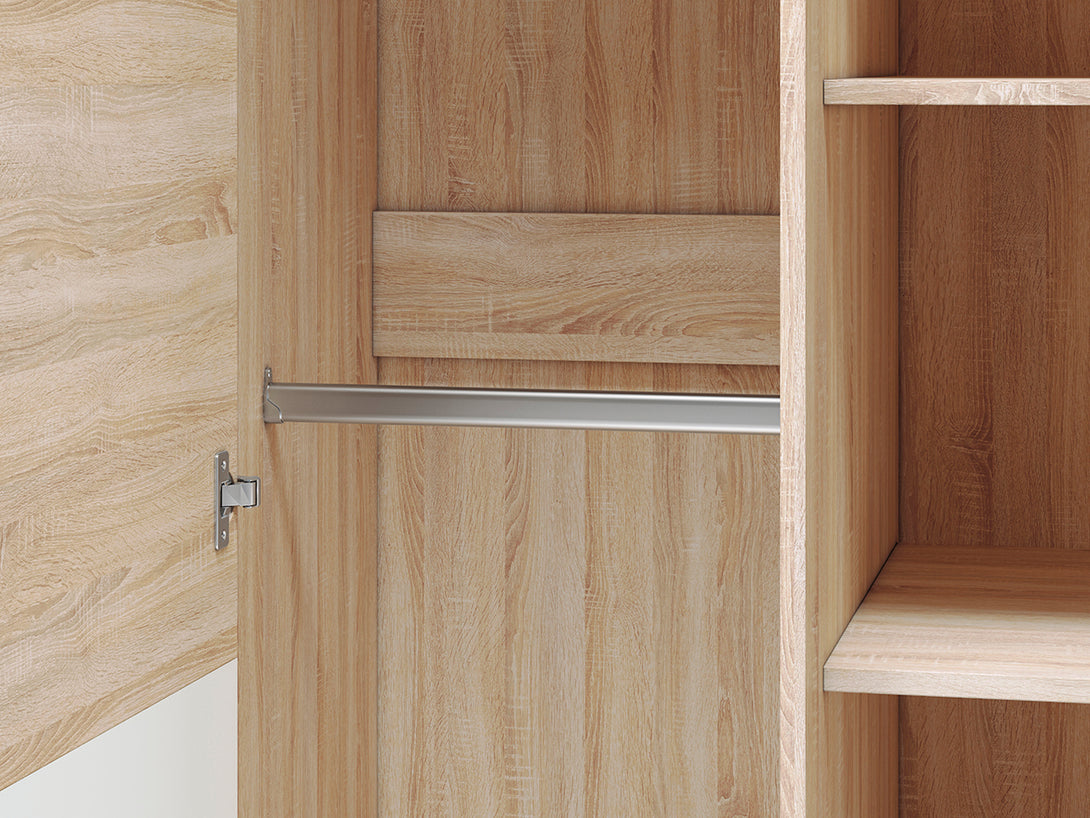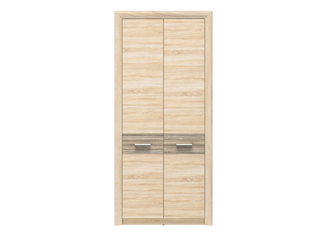 Der CASTEL I Kleiderschrank kombiniert zeitloses Design mit funktionaler Ausstattung und bietet dank seiner Höhe von 201 cm und einer Breite von 92 cm großzügigen Stauraum für Kleidung und Accessoires. Die hochwertige laminierte Spanplatte mit ABS-Kanten sorgt für Langlebigkeit, während die Front in eleganter MDF Sonoma Truflowa dem Schrank ein modernes, wohnliches Erscheinungsbild verleiht. Die Kombination aus heller Sonoma und dunklerer Truflowa-Oberfläche passt ideal zu verschiedenen Einrichtungsstilen und sorgt für ein harmonisches Gesamtbild in Ihrem Schlafzimmer oder Flur.