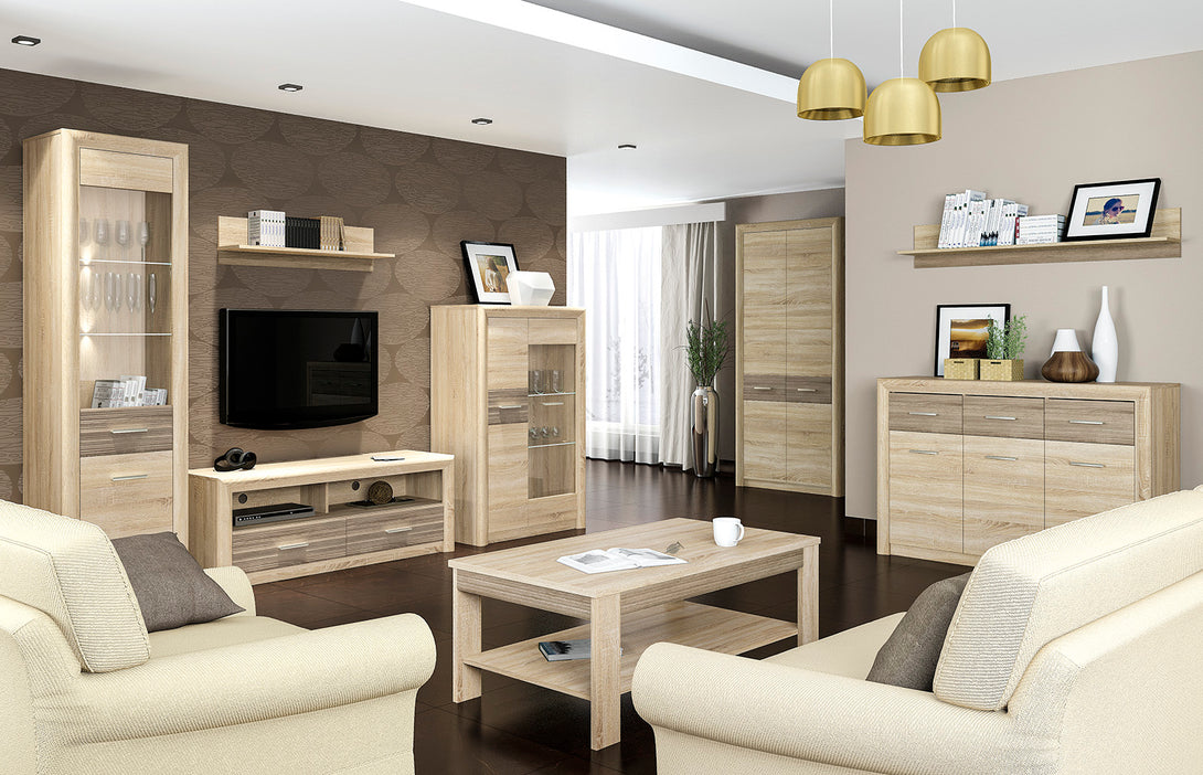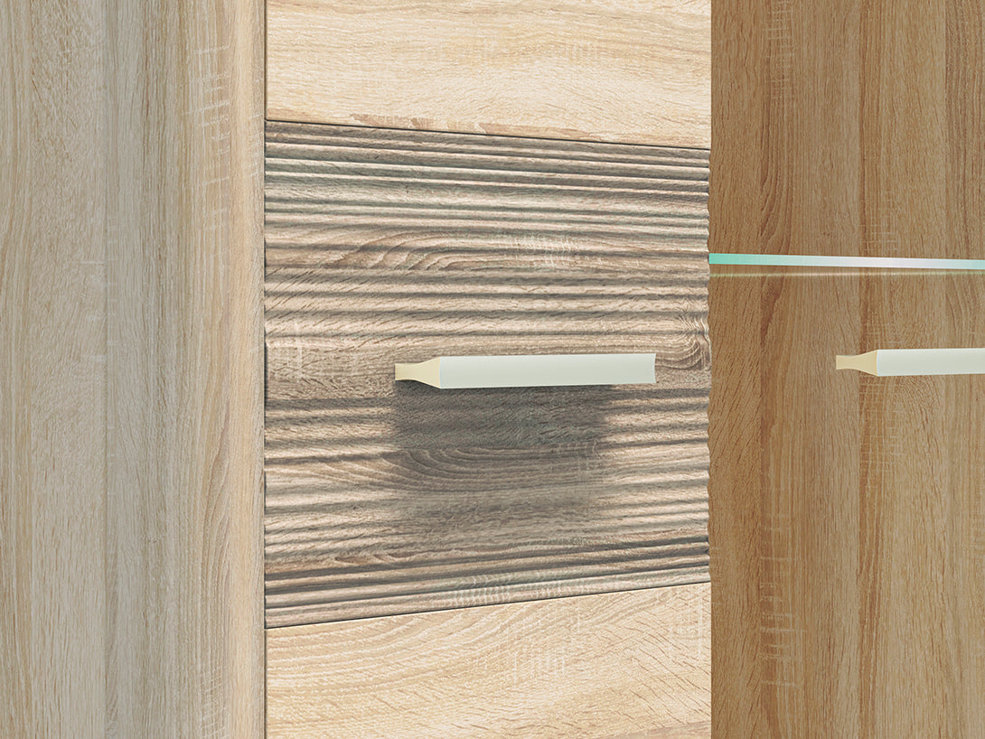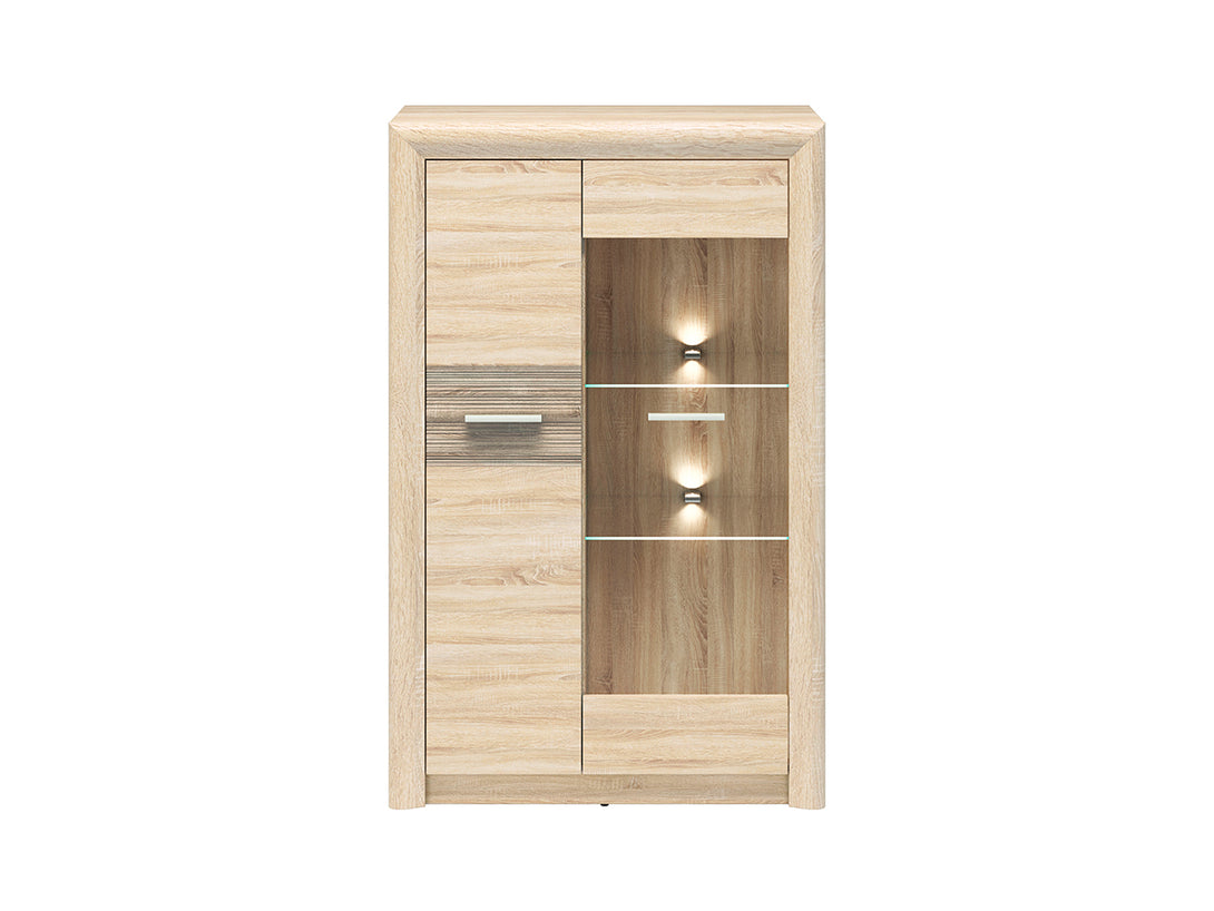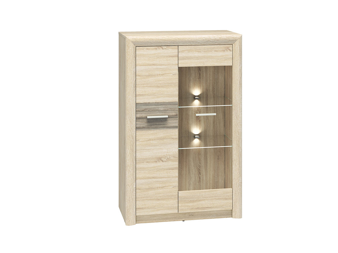 Die CASTEL Kompaktvitrine vereint kompaktes Maß mit stilvoller Eleganz und ist die ideale Lösung für kleinere Räume mit Anspruch an Design. Die hochwertige Glasvitrine bietet funktionalen Stauraum und eine attraktive Möglichkeit zur Präsentation Ihrer Lieblingsstücke. Die Kombination aus hellen Sonoma-Oberflächen und trüffelfarbenen MDF-Fronten erzeugt ein natürliches, modernes Erscheinungsbild und sorgt für ein harmonisches Wohnambiente.