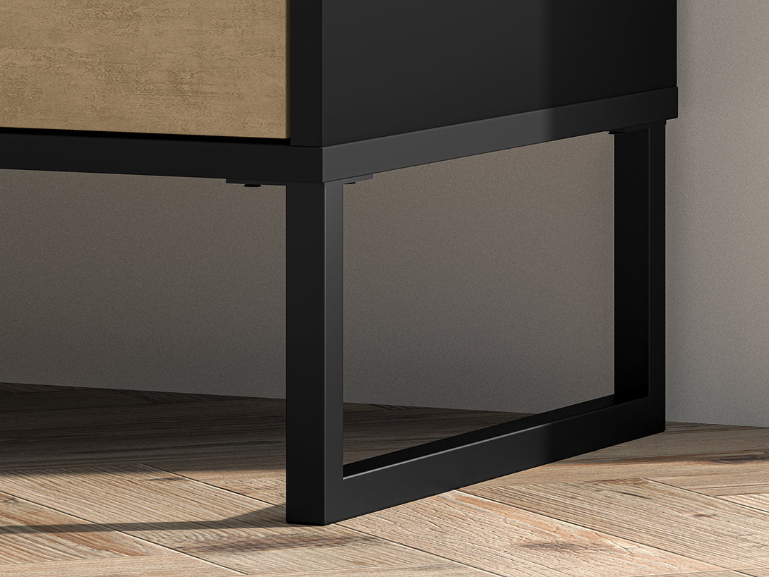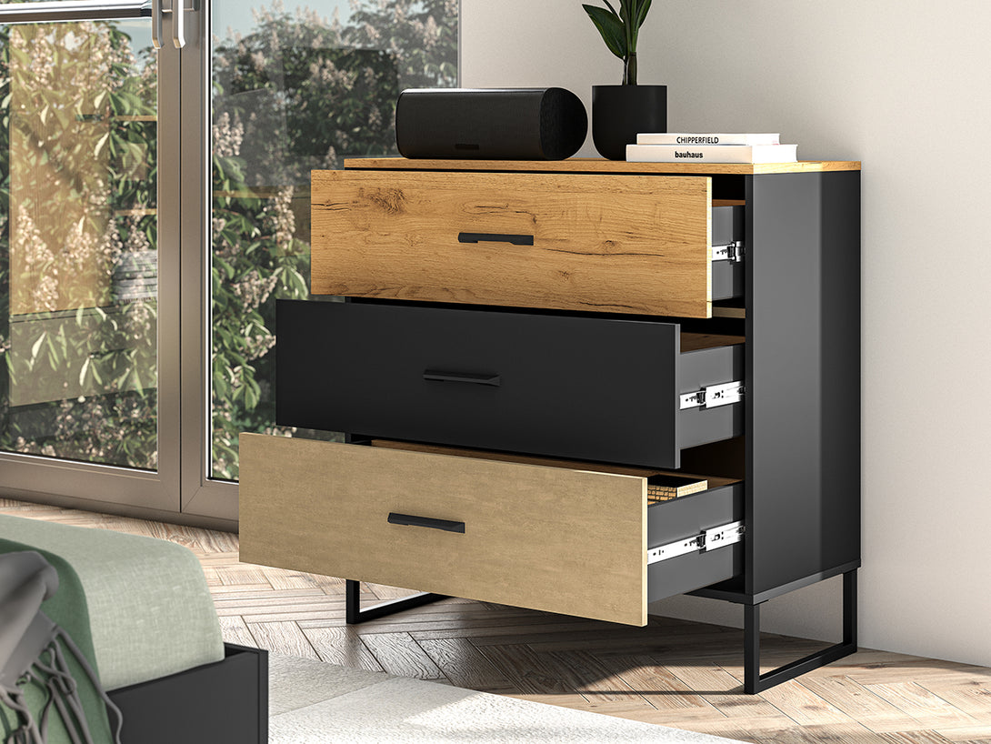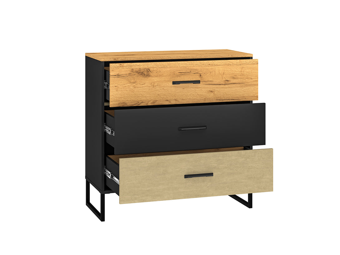 Die COLT 05 Kommode überzeugt durch eine hochwertige laminierte Oberfläche in der eleganten Kombination aus Dąb Craft Złoty, Schwarz und Premium Stahl. Ausgestattet mit robusten ABS-Kanten und vollausziehbaren Schubladen mit erhöhter Tragkraft bietet sie viel Stauraum bei kompakter Bauweise. Die klare Formensprache und das moderne Design machen diese Kommode zu einem funktionalen Highlight in jedem Wohnraum.