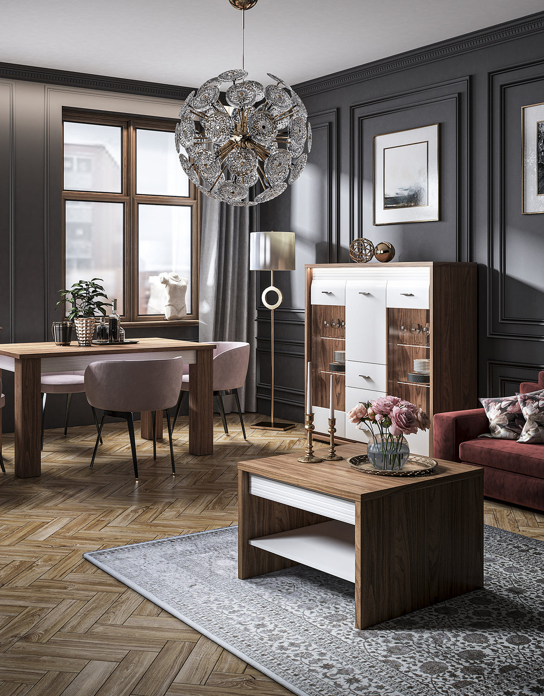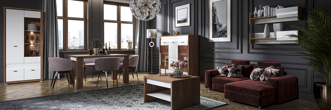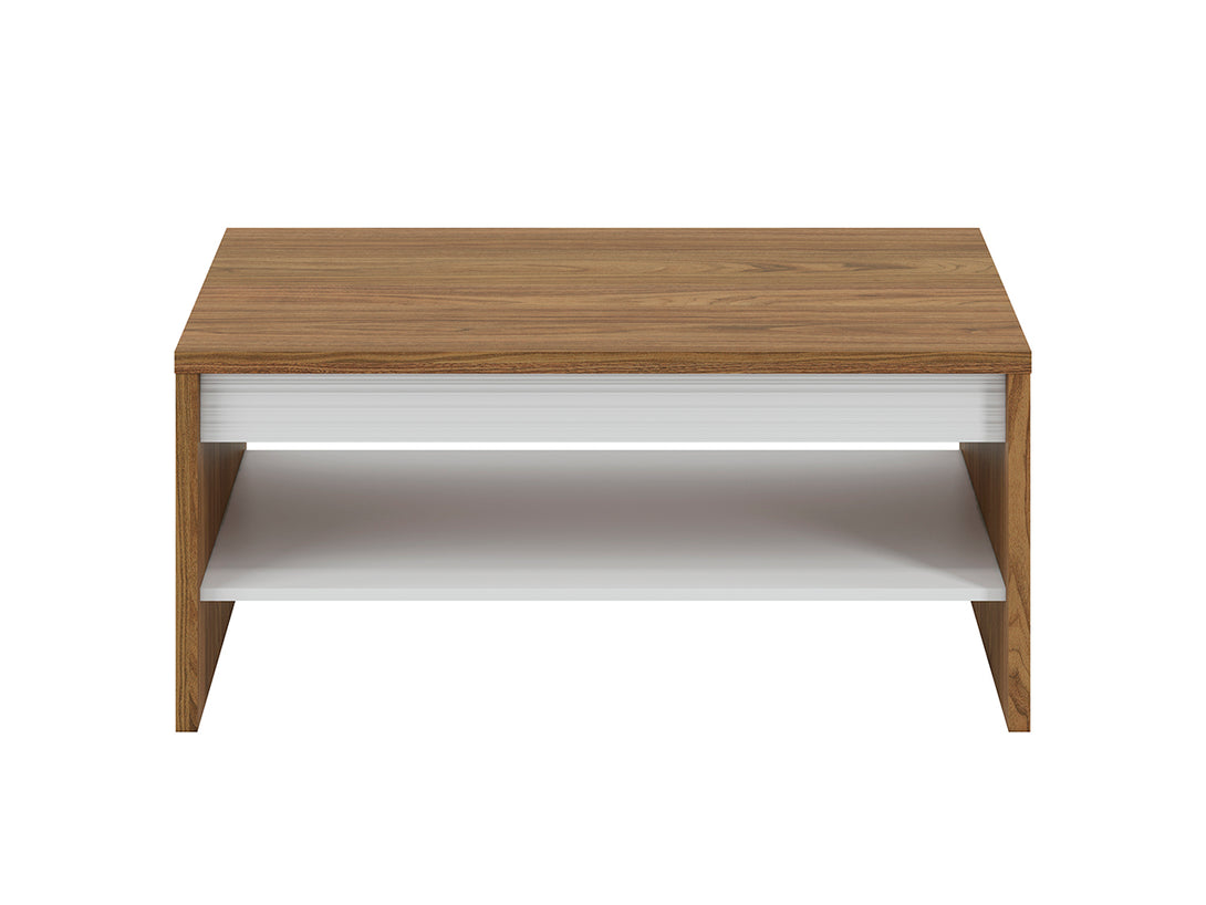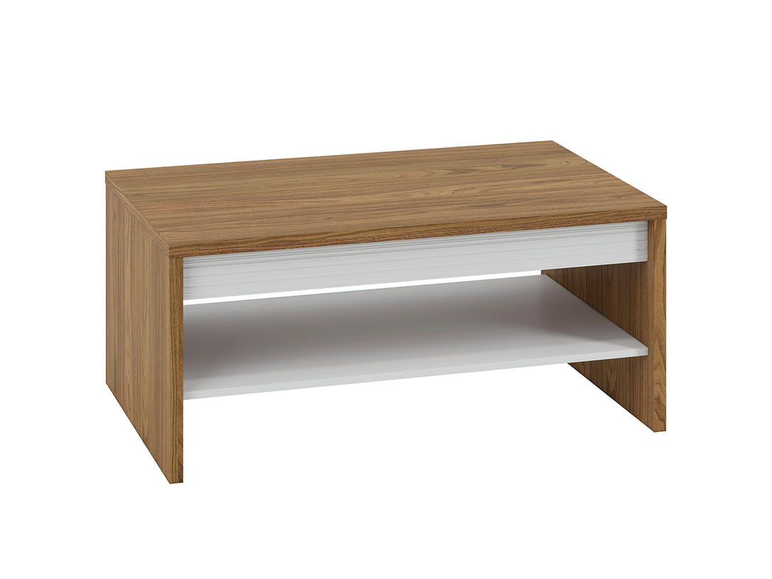 Der DALLAS 1601 Couchtisch besticht durch sein elegantes, minimalistisches Design in hochwertiger Kombination aus natürlichem Nussbaum und Weiß Hochglanz. Die klare Formensprache mit geschwungenen MDF-Facetten und die raffinierte Riffelstruktur verleihen dem Möbelstück zeitlose Ästhetik und Ausdruckskraft. Die langlebige Verarbeitung mit ABS-Kanten und laminierter Platte macht diesen Tisch besonders widerstandsfähig gegen Kratzer, Feuchtigkeit und Hitze.