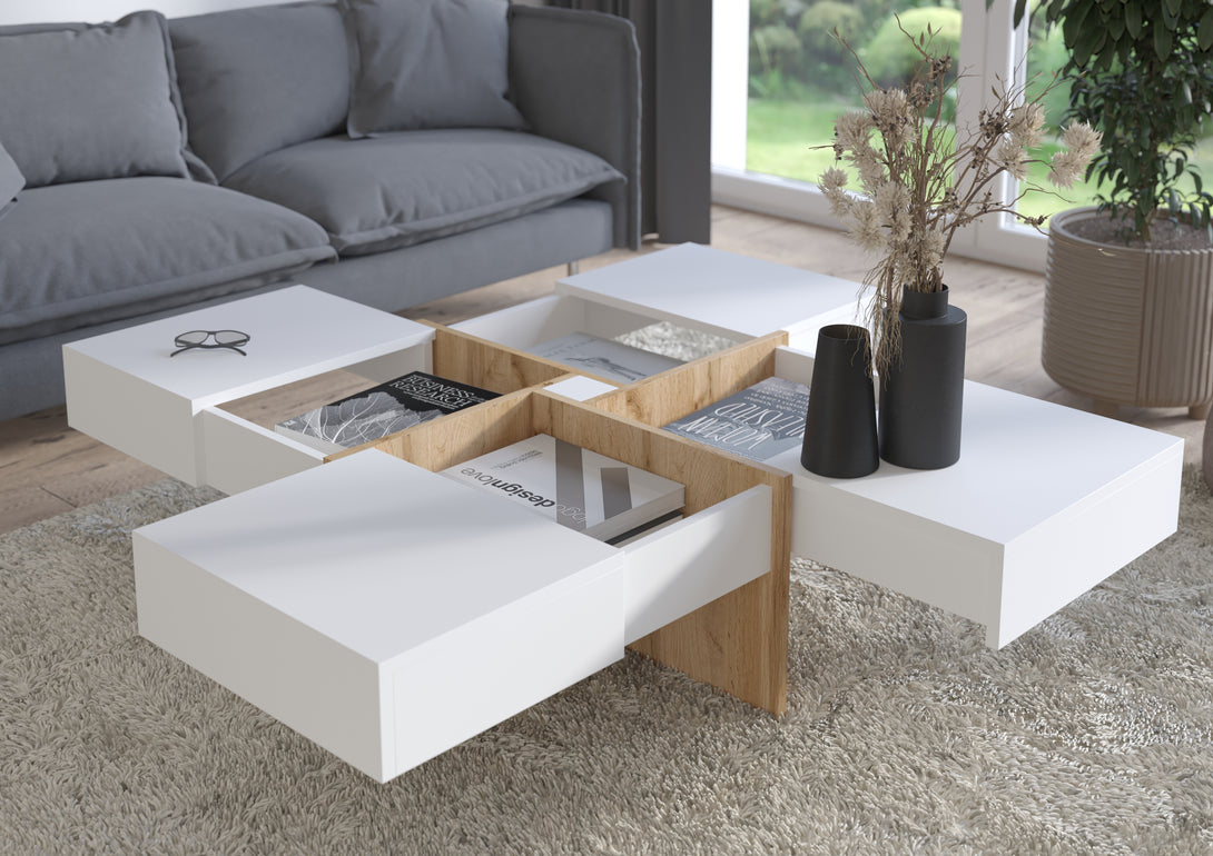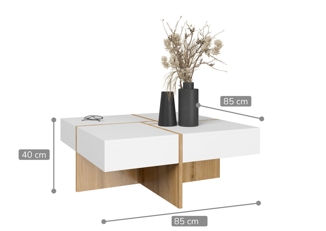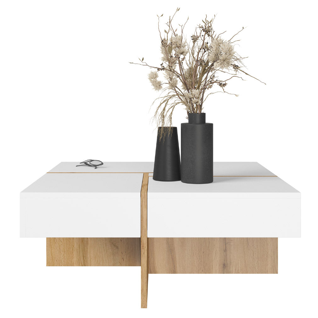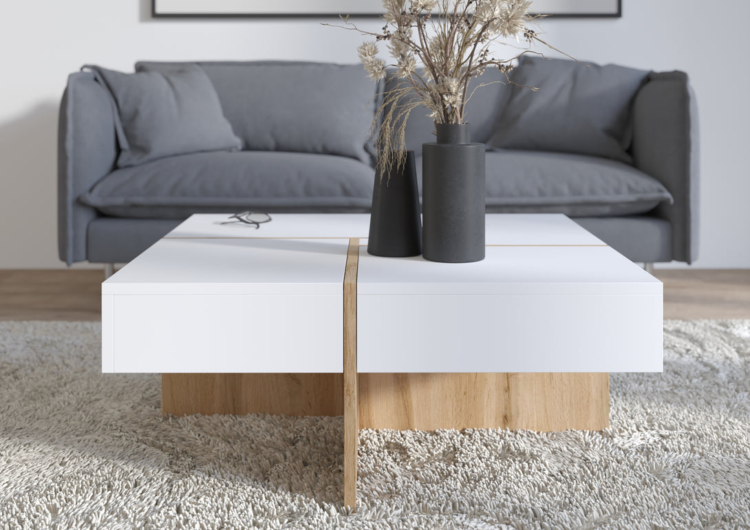 Der Couchtisch DRAW vereint Funktionalität und stilvolles Design in einem kompakten Format. Seine Kombination aus weiß matter Front und Artisan Eiche verleiht jedem Wohnraum eine moderne, aber gleichzeitig wohnliche Atmosphäre. Die klaren Linien und die harmonische Farbgebung machen ihn zu einem vielseitig einsetzbaren Möbelstück.
