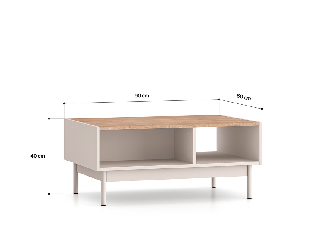 Drei praktische Fächer unterhalb der Platte bieten zusätzlichen Stauraum für Bücher, Magazine oder Alltagsgegenstände. Die Kombination aus Kaschmirfarbe und Eichenoptik verleiht dem Tisch eine moderne und warme Ausstrahlung. Stabile Metallbeine runden das hochwertige Erscheinungsbild ab.