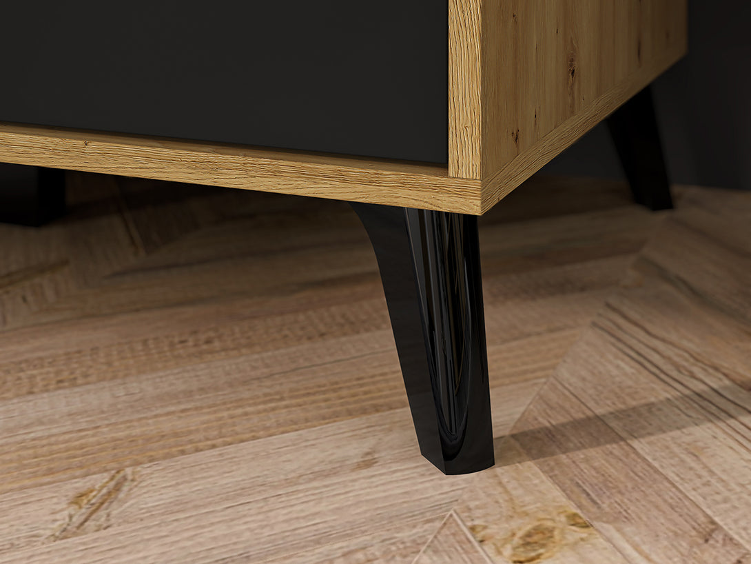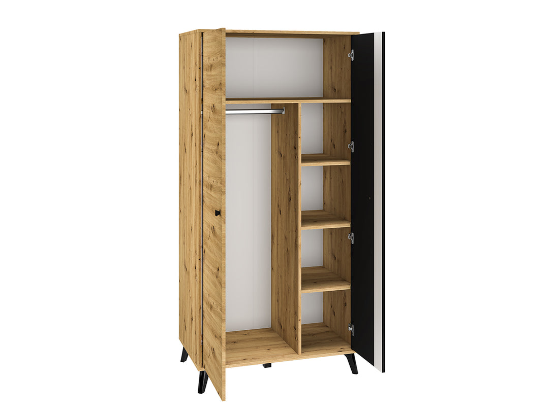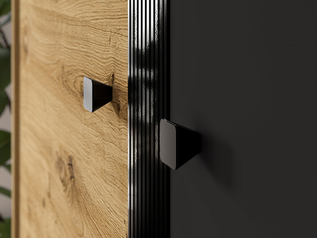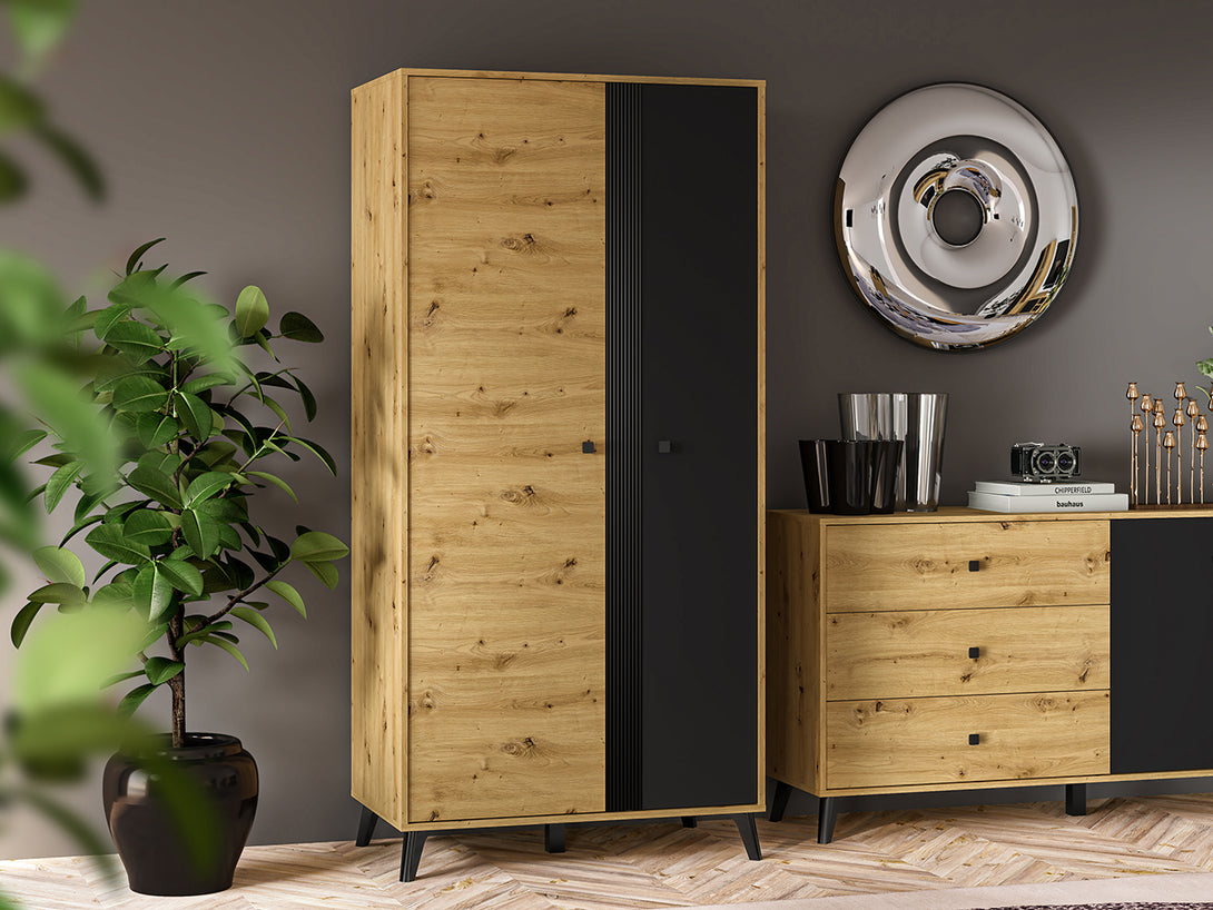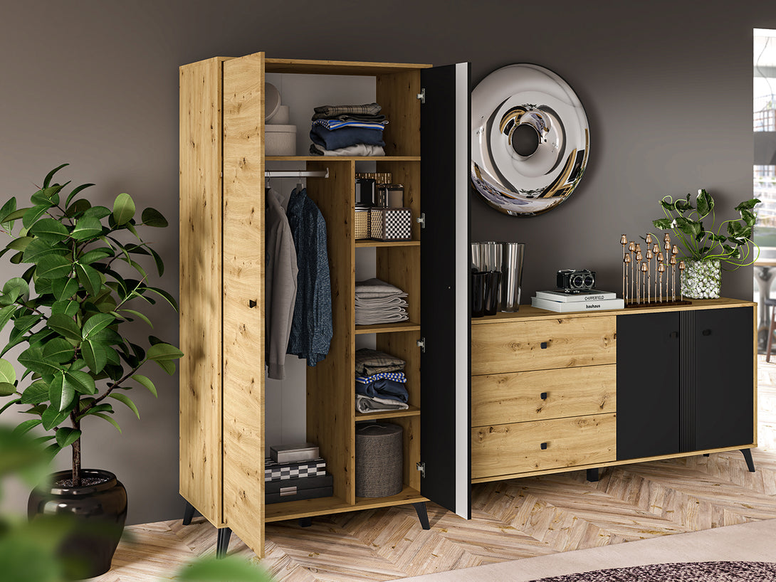 Dank hochwertiger Verarbeitung mit ABS-Kanten und laminierten Oberflächen steht der Schrank für Langlebigkeit und Stabilität. Die Kombination aus Artisan Oak und schwarzem Korpus verleiht dem Möbelstück eine moderne und zugleich zeitlose Ausstrahlung.