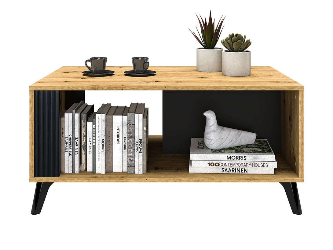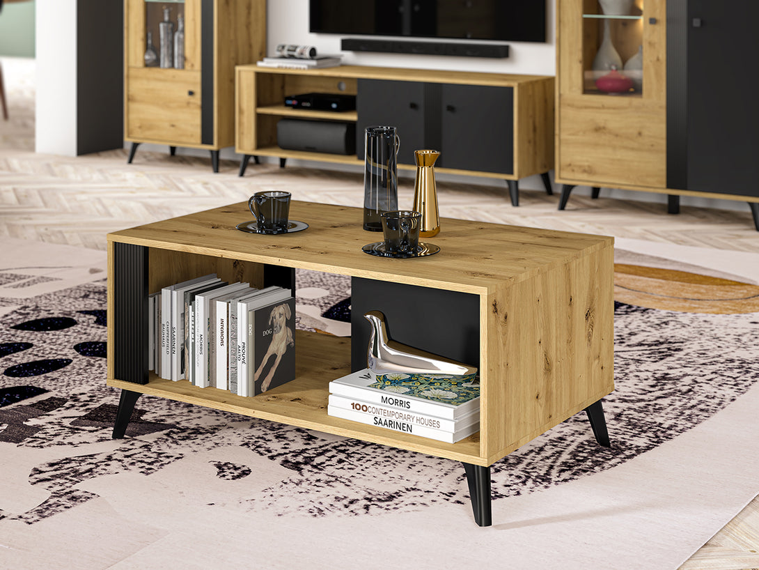 Der ELIZABETH Couchtisch überzeugt durch sein minimalistisches Design in eleganter Holzoptik und bildet das stilvolle Zentrum jedes Wohnzimmers. Die Kombination aus Artisan Oak und schwarzen Elementen verleiht dem Tisch eine zeitgemäße Ausstrahlung, die sich harmonisch in verschiedene Einrichtungsstile einfügt.
