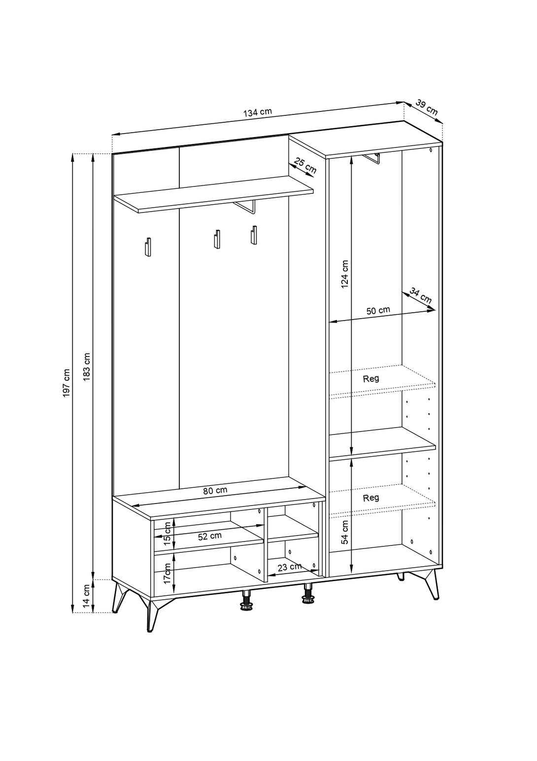 Produktbeschreibung: Die Garderobe G134 aus der DIAMOND-Serie ist eine elegante und funktionale Lösung für moderne Eingangsbereiche. Die Kombination aus natürlicher Eiche-Evoke-Front und tiefschwarzem Korpus verleiht dem Möbelstück einen warmen, modernen Charakter. Der große Spiegelschrank erleichtert das schnelle Überprüfen des Outfits und bietet gleichzeitig geschlossenen Stauraum für Kleidung oder Accessoires. Die offene Garderobenleiste mit Haken und Ablage sorgt für schnellen Zugriff auf Jacken, Taschen und Alltagsutensilien. Die komfortable Sitzbank mit dekorativer Chevron-Front bietet zusätzlichen Stauraum und schafft einen bequemen Platz zum Anziehen von Schuhen. Robuste Materialien und stabile Metallfüße garantieren Langlebigkeit und ein hochwertiges Erscheinungsbild. Ideal für Flure, Eingangsbereiche oder kleine Dielen, die Stil und Funktionalität miteinander verbinden möchten.