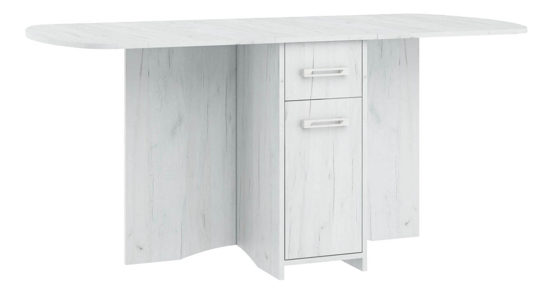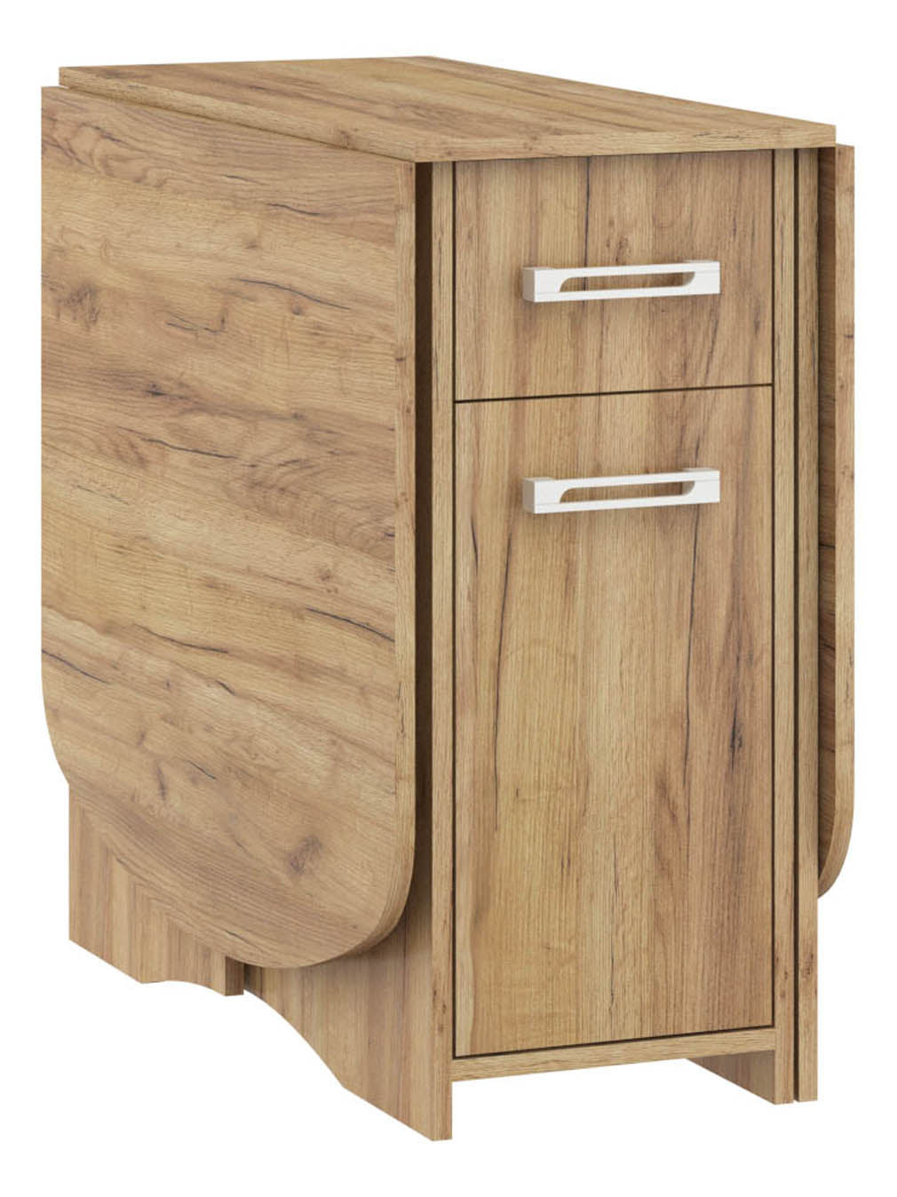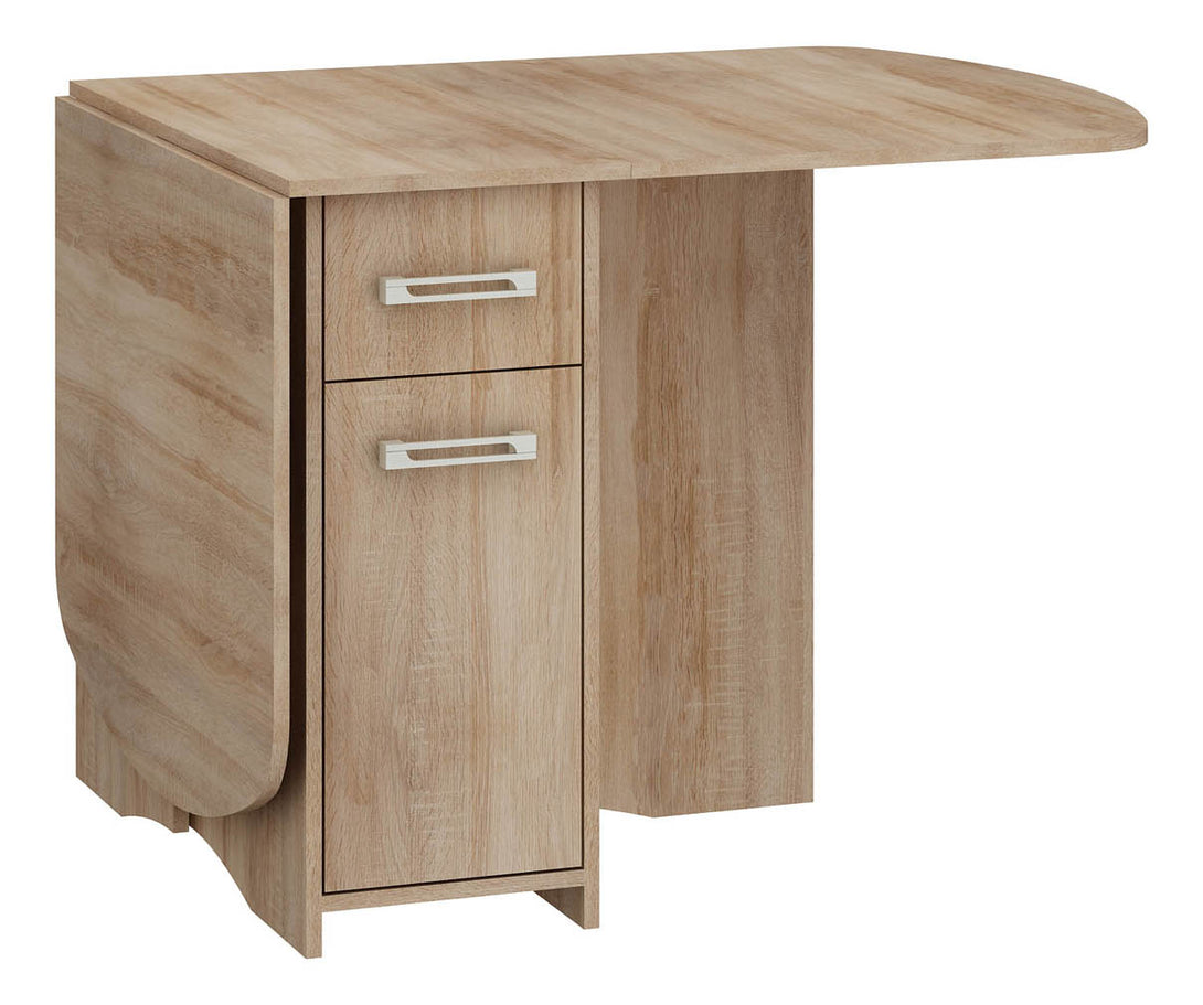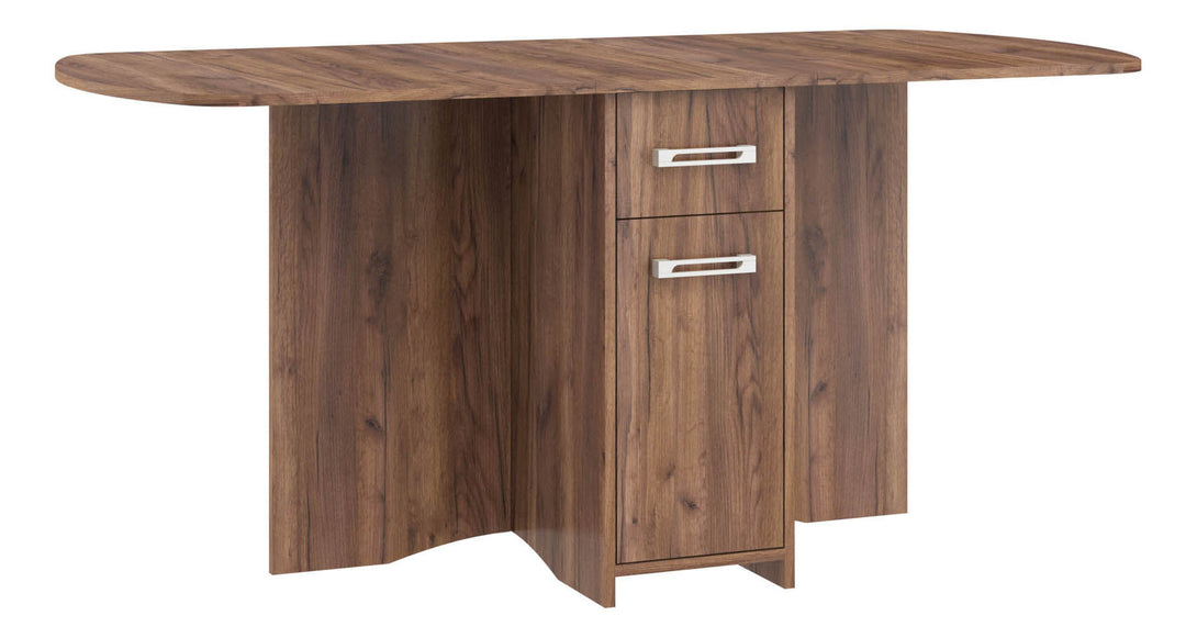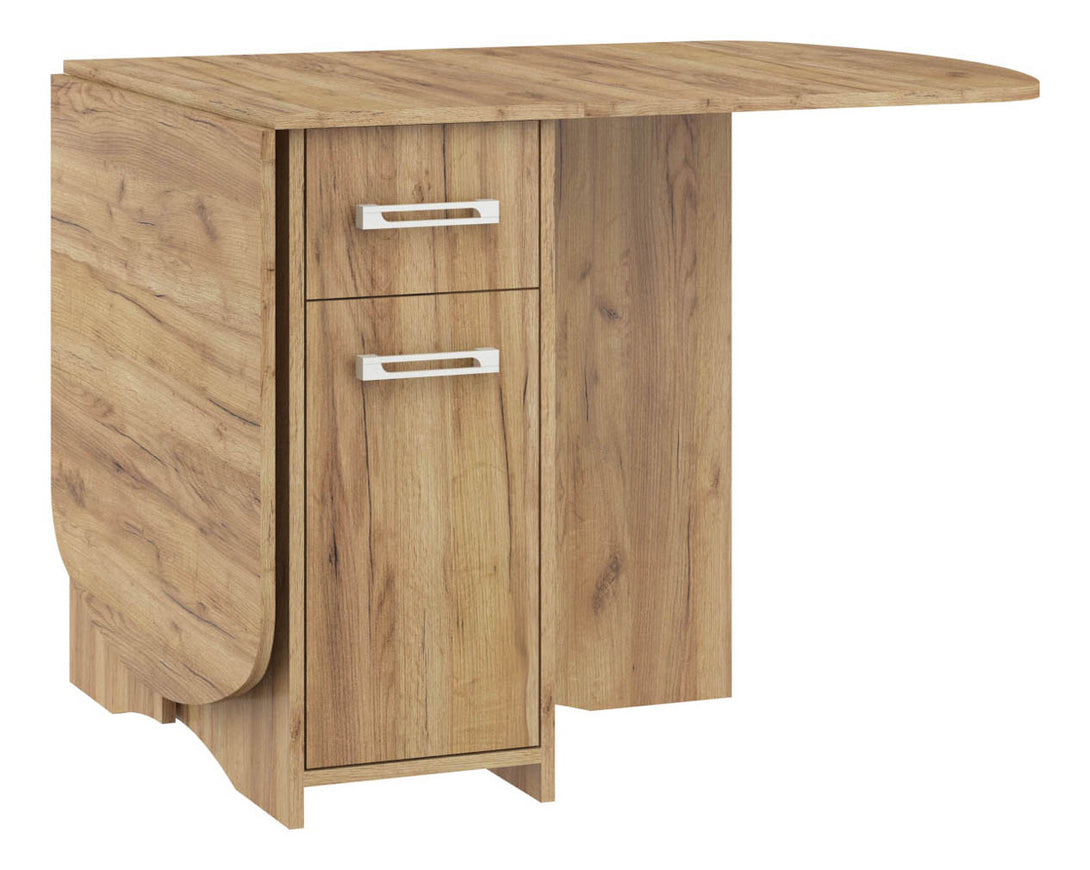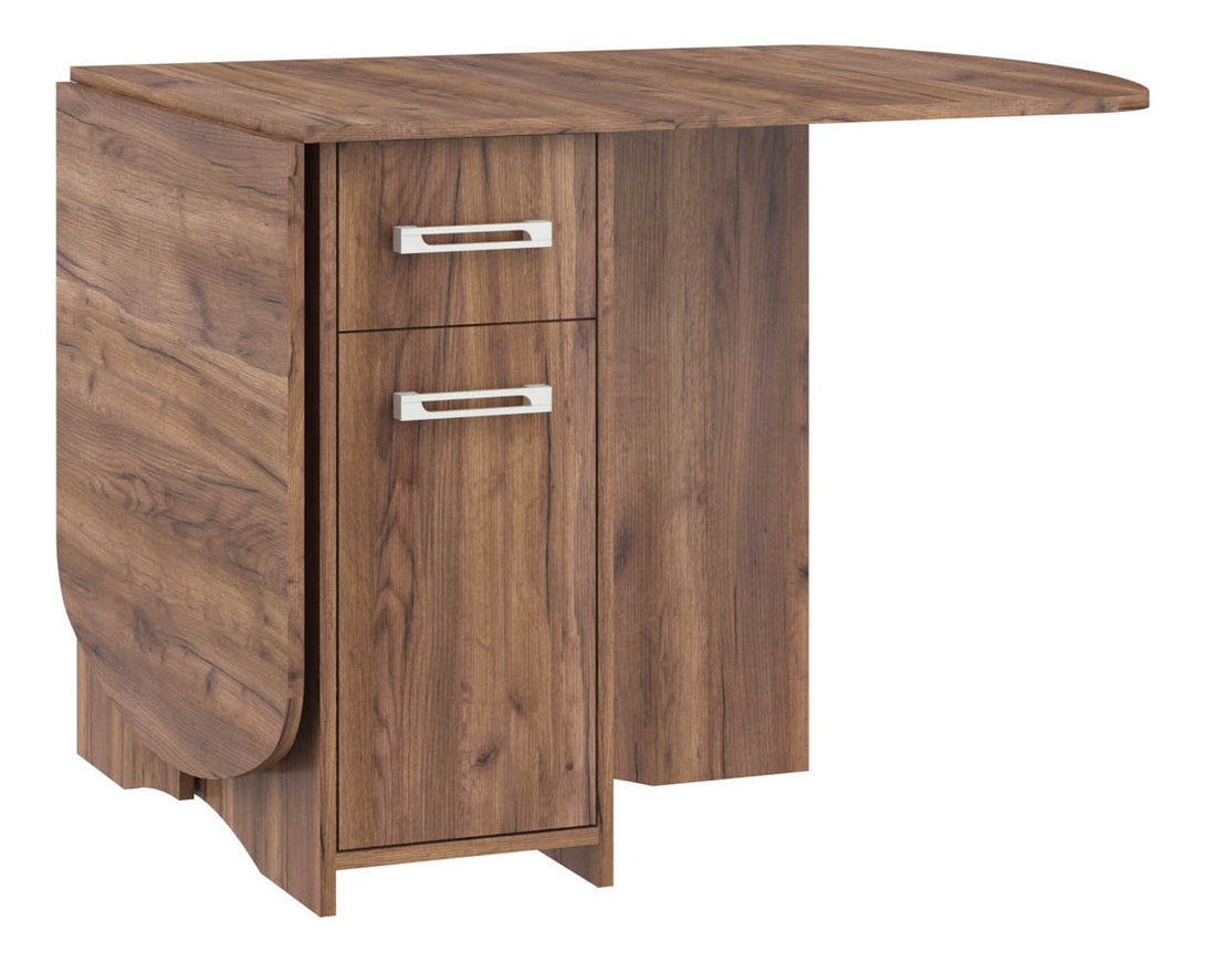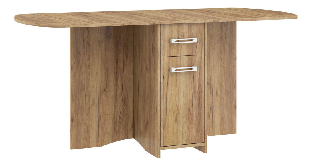 Zusätzlich verfügt der Tisch über einen geräumigen Schrank mit Schublade, der für zusätzlichen Stauraum sorgt. Die klare Linienführung, die natürliche Holzoptik und die robuste Verarbeitung machen dieses Möbelstück zu einem funktionalen und ästhetischen Highlight in jedem Zuhause.