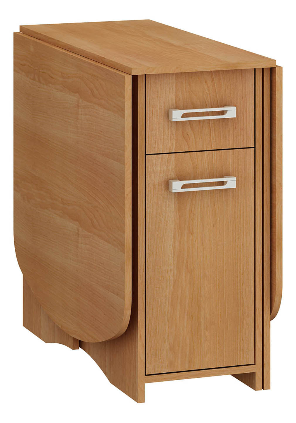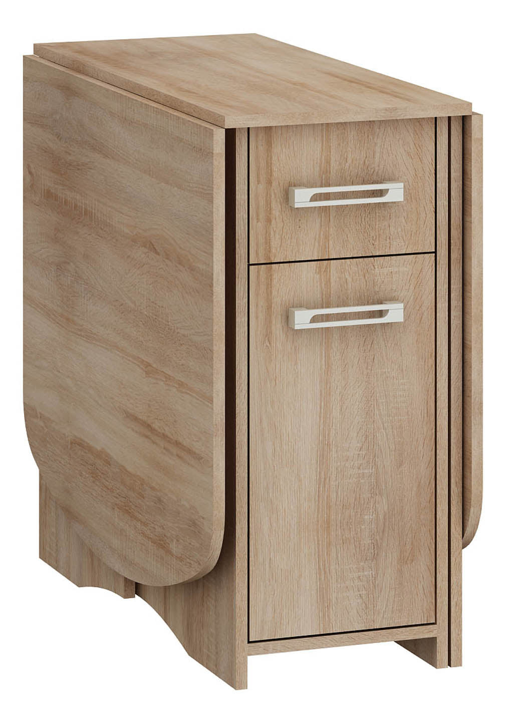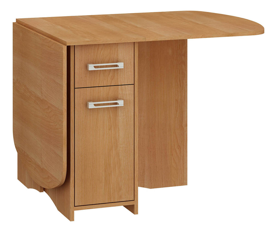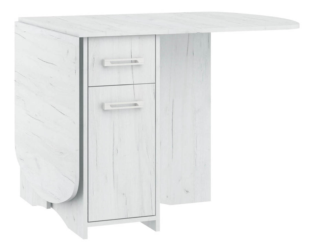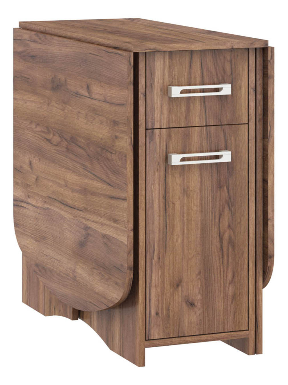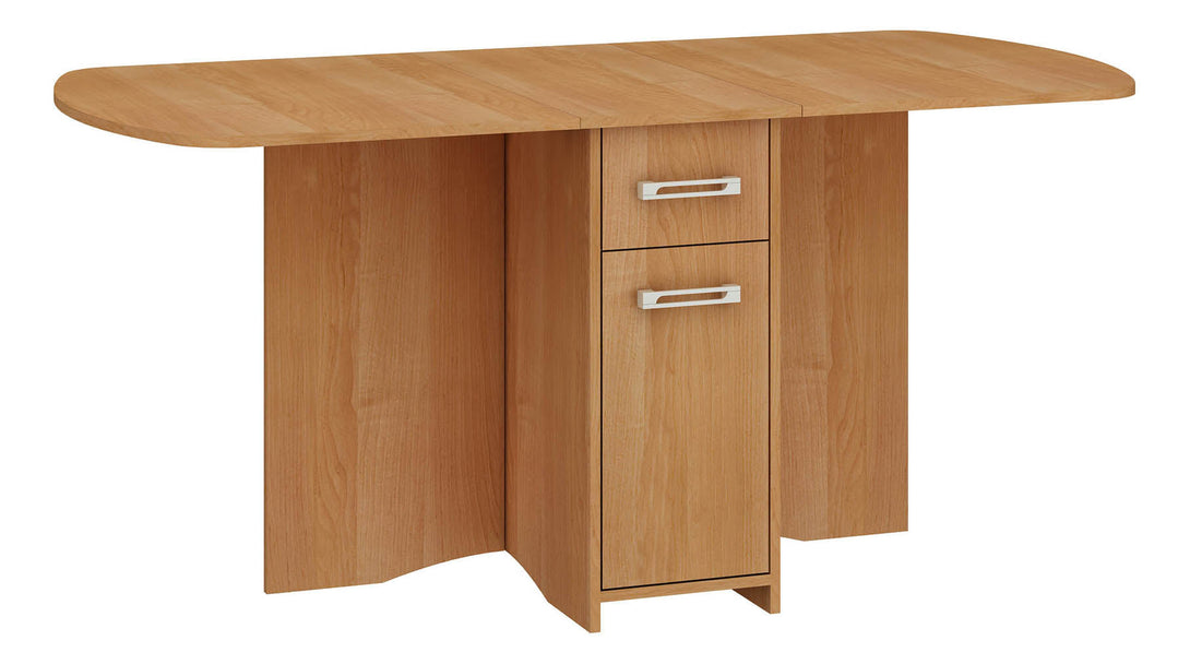 Zusätzlich verfügt der Tisch über einen geräumigen Schrank mit Schublade, der für zusätzlichen Stauraum sorgt. Die klare Linienführung, die natürliche Holzoptik und die robuste Verarbeitung machen dieses Möbelstück zu einem funktionalen und ästhetischen Highlight in jedem Zuhause.