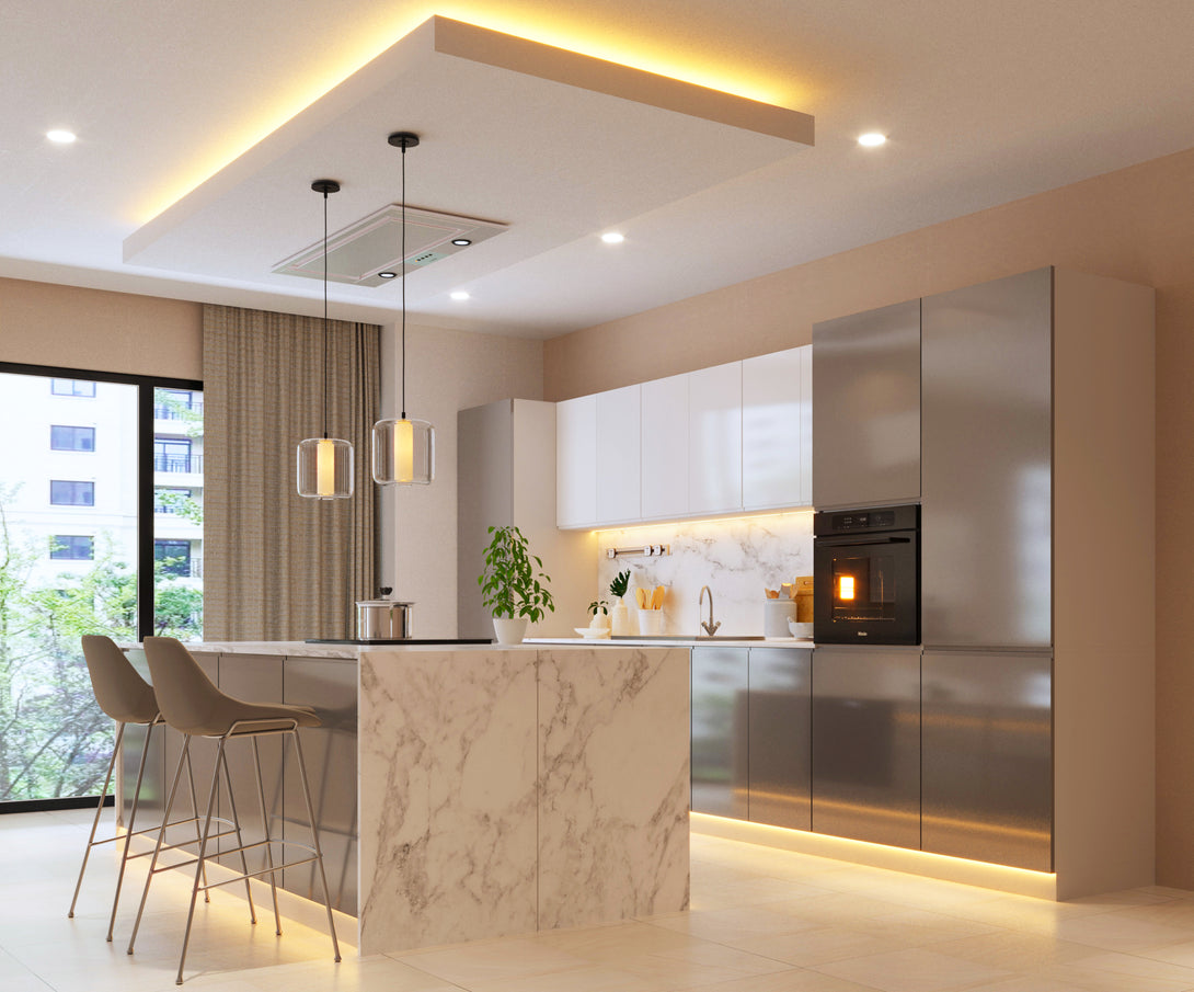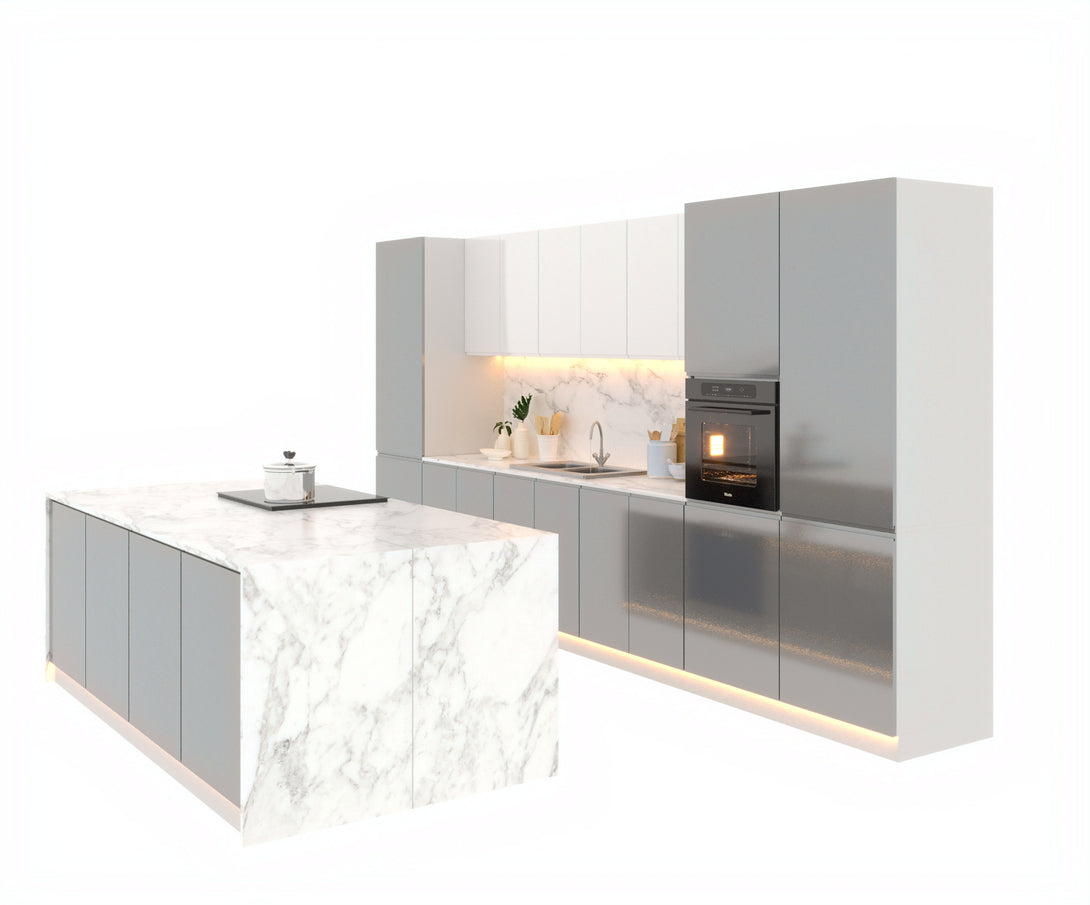 Die Glanzia Inselküche KU-S13 vereint Funktionalität und zeitloses Design. Mit einer geräumigen Kücheninsel, modernen Hochglanz-Fronten und optimaler Stauraumaufteilung bringt sie Eleganz und Komfort in Ihr Zuhause. Die modulare Struktur passt perfekt in moderne Wohnräume.