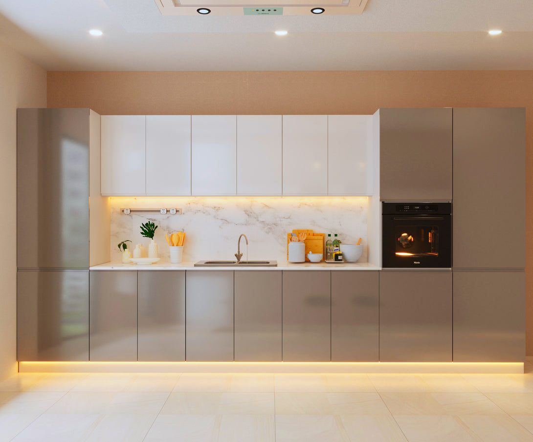 Küchenmöbel-Set Glanzia 420 cm – Hochglanz Grau / Weiß