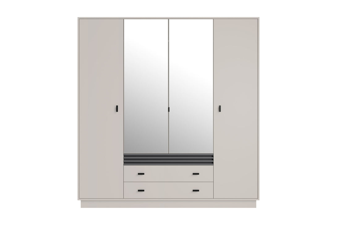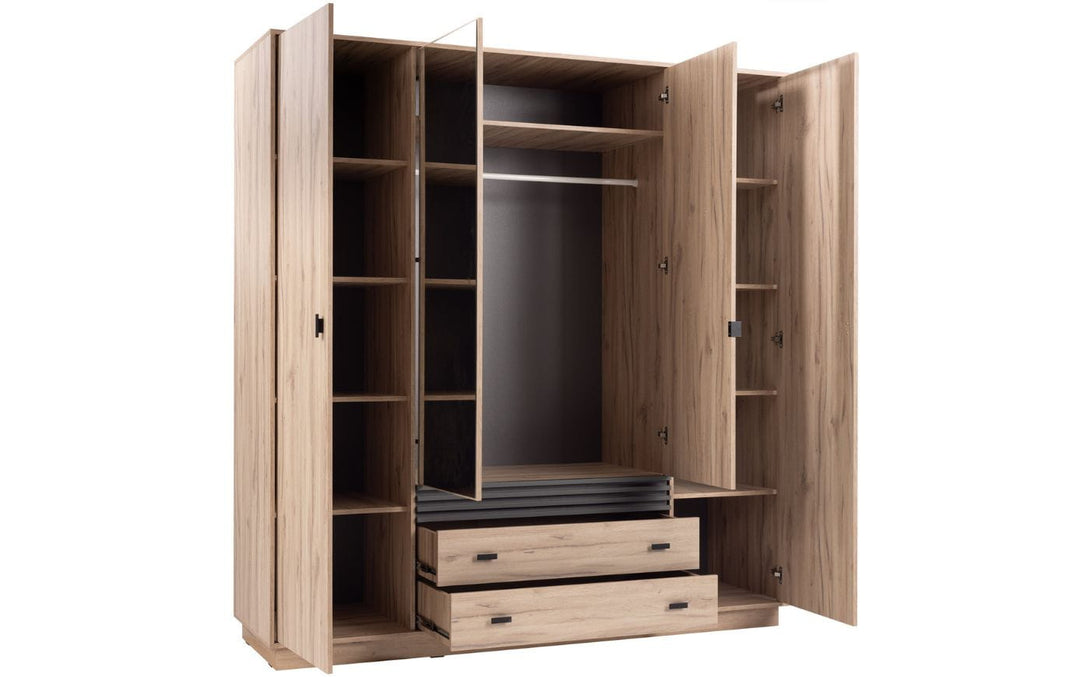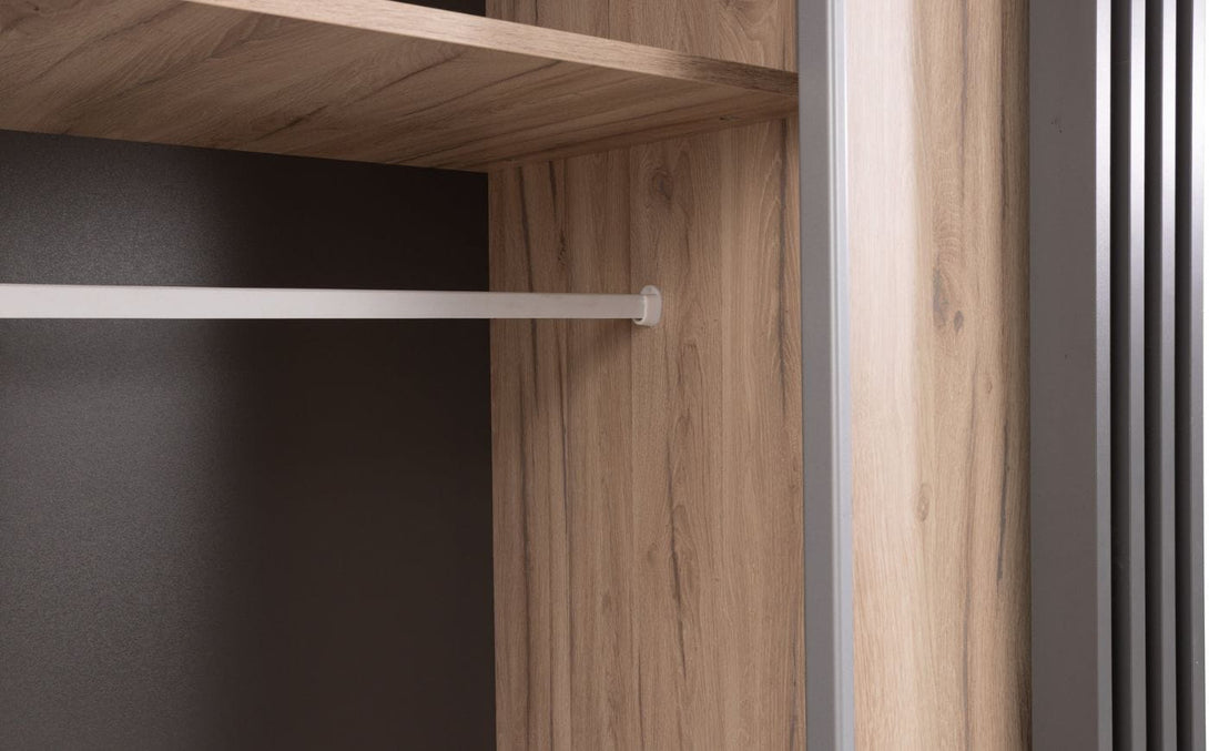 Dieser geräumige Kleiderschrank aus dem ALLMO System eignet sich ideal für Schlafzimmer, Ankleidezimmer oder moderne Flure. Die Kombination aus heller Estana Eiche und Anthrazit verleiht dem Raum einen zeitgemäßen, warmen Charakter. Hinter den Türen befindet sich eine funktionale Innenaufteilung, die ausreichend Platz für Kleidung, Wäsche und Accessoires bietet. Die robuste 16-mm Laminatplatte sorgt für Stabilität, während ABS-Kanten zusätzlichen Schutz garantieren. Dank Spiegeltür erhält der Raum mehr Tiefe und Licht, was den Schrank besonders praktisch im Alltag macht.