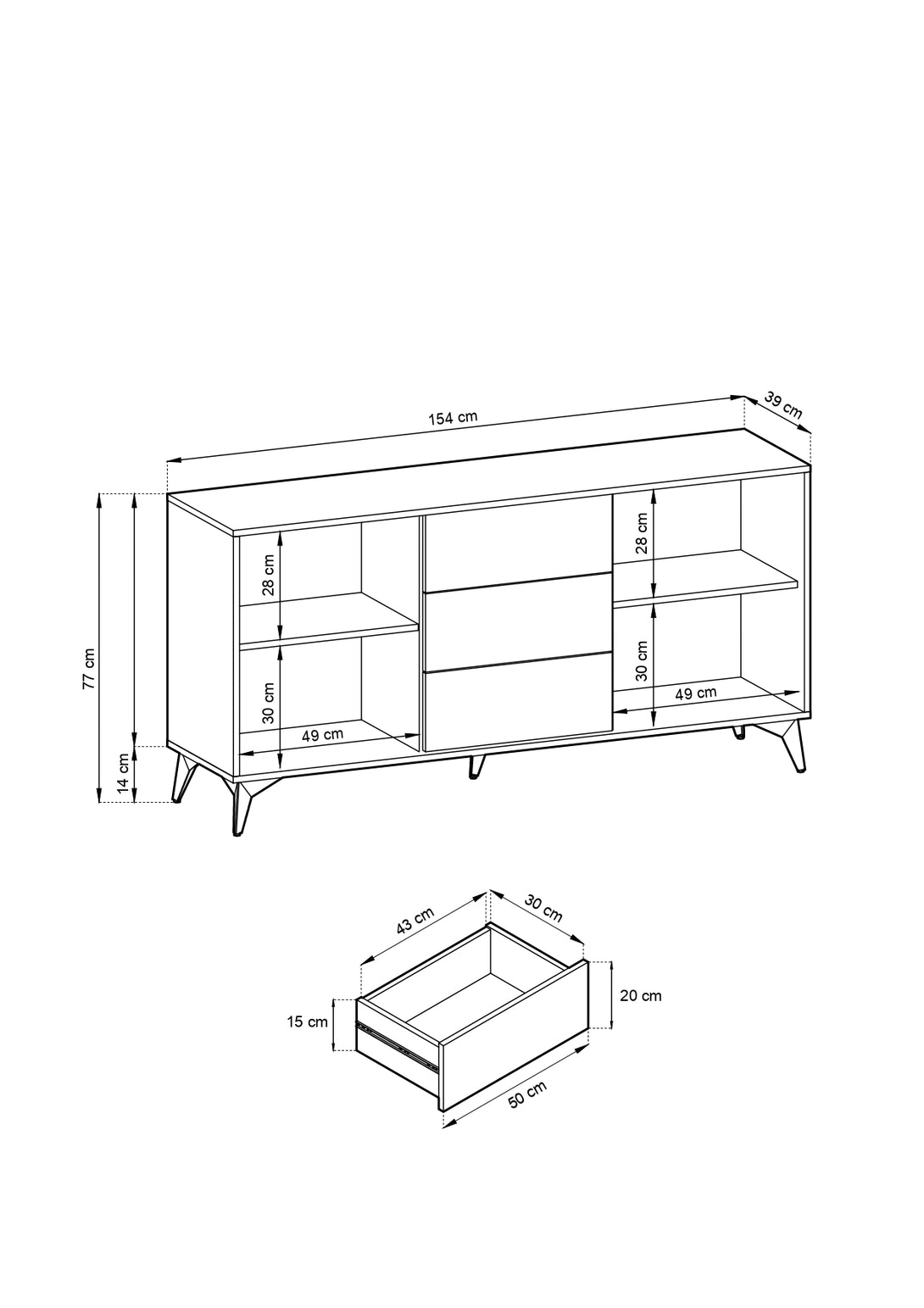 Produktbeschreibung: Die Kommode KSZ154 aus der DIAMOND-Serie verbindet stilvolle Ästhetik mit hoher Funktionalität und großzügigem Stauraum. Die Kombination aus natürlicher Eiche-Evoke-Front und dekorativer Chevron-Struktur verleiht dem Möbelstück eine elegante, moderne Ausstrahlung. Drei geräumige Schubladen bieten optimalen Platz für kleinere Gegenstände, Kleidung oder Dokumente, während die beiden Türen zusätzliche Ablageflächen mit praktischen Einlegeböden verbergen. Der schwarze Korpus schafft einen raffinierten Kontrast, der die Holzstruktur besonders hervorhebt. Die schrägen Metallfüße sorgen für Stabilität und eine leichte, trendige Optik. Eine ideale Lösung für Wohn-, Ess- oder Schlafzimmer, in denen Stauraum und modernes Design gleichermaßen wichtig sind.