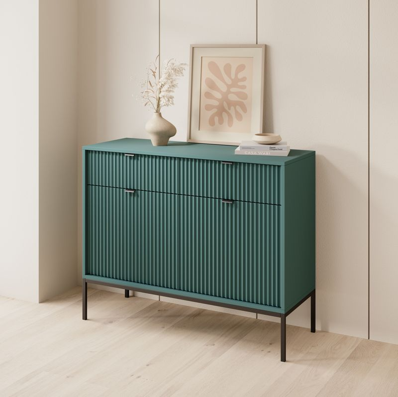 Die KSZ104 Kommode der NOVA Serie in Grün verbindet ausdrucksstarke Farbgestaltung mit einer klar strukturierten Rillenfront, die sofort ins Auge fällt. Die oberen Klappen eignen sich hervorragend zur Aufbewahrung von Accessoires oder Alltagsgegenständen, die griffbereit bleiben sollen, während die unteren Türen mit gut aufgeteilten Ablagefächern viel Platz für Geschirr, Textilien oder dekorative Elemente bieten. Die tiefgrüne Oberfläche setzt einen modernen, trendigen Akzent im Wohnraum und harmoniert sowohl mit hellen als auch mit dunklen Einrichtungstönen. Das schwarzmetallene Gestell sorgt für Stabilität und gibt dem Möbel eine leichte, schwebende Wirkung. KSZ104 ist die ideale Wahl für alle, die stilvollen Stauraum in Wohnzimmer, Esszimmer oder Flur suchen.