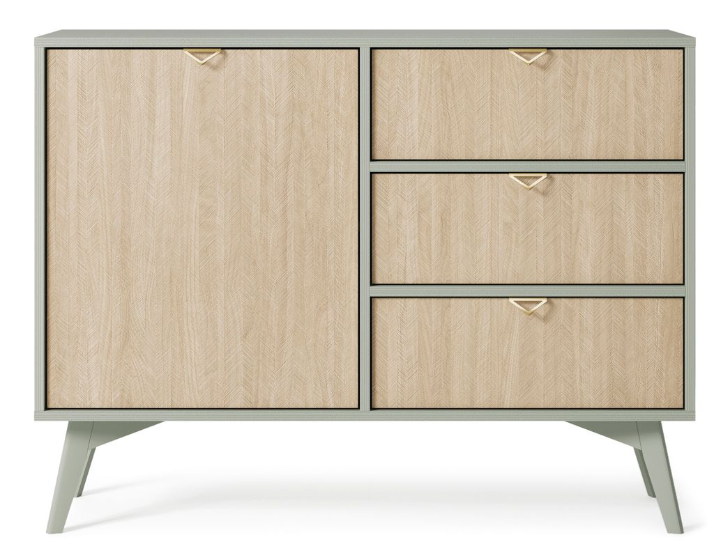 Produktbeschreibung: Die Kommode KSZD106 aus der FOREST-Serie verbindet funktionalen Stauraum mit einem eleganten, skandinavisch inspirierten Look. Auf der linken Seite befindet sich ein geräumiges Fach mit Tür und Einlegeboden, ideal für größere Gegenstände, Geschirr oder Textilien. Rechts sorgen drei großzügige Schubladen dafür, dass kleinere Utensilien, Kleidung oder Dokumente übersichtlich und griffbereit verstaut werden können. Der Korpus in der Farbe Eukalyptus bildet einen harmonischen Kontrast zu den hellen Fronten in Holzoptik und verleiht dem Möbelstück eine ruhige, moderne Ausstrahlung. Die schräg gesetzten Beine unterstreichen den leichten Retro-Charakter und sorgen gleichzeitig für einen sicheren, stabilen Stand. Dank der pflegeleichten Oberflächen ist die Kommode bestens für den täglichen Gebrauch geeignet und lässt sich einfach reinigen.