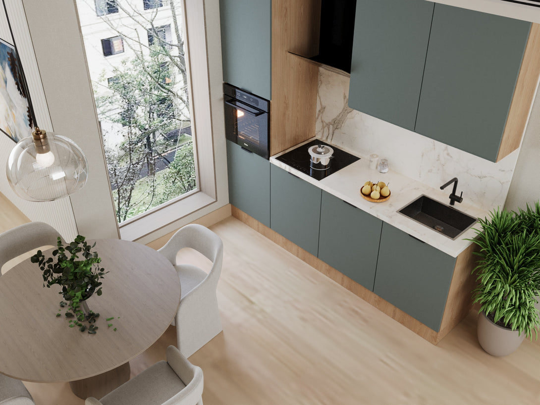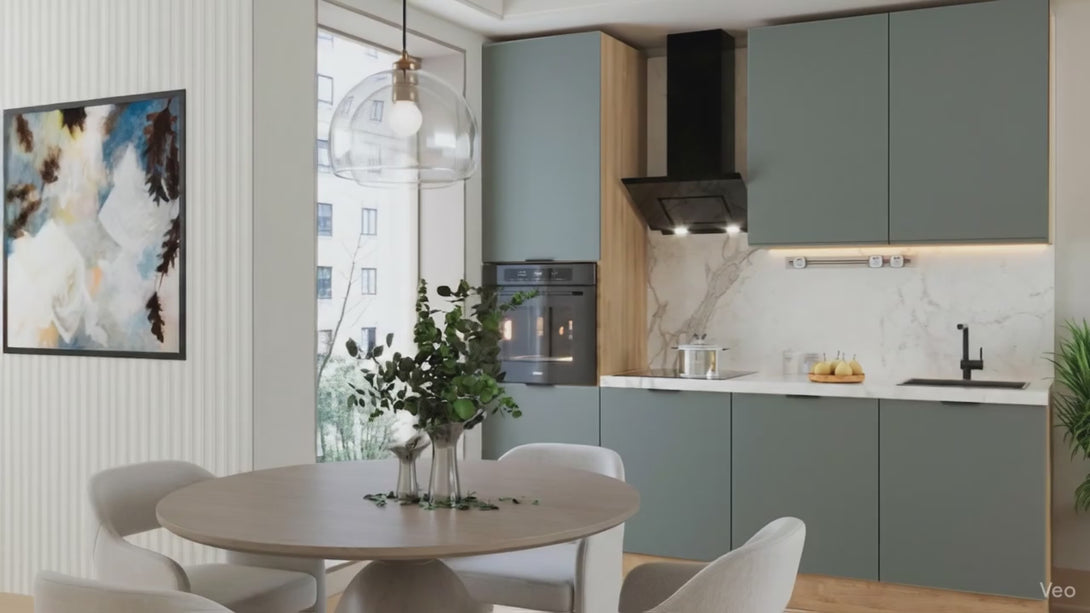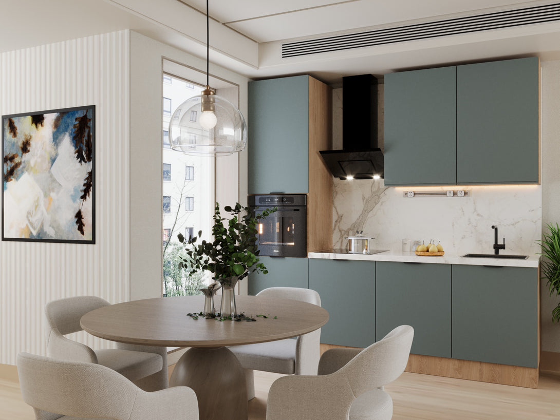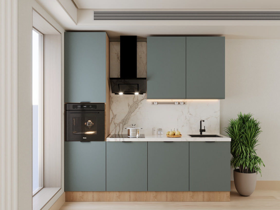 Die Livaro Küchenzeile KU-S22 vereint Funktionalität und Ästhetik in einer modernen Farbkombination aus grünem Matt und Sonoma Eiche. Diese Kombination verleiht Ihrem Raum Wärme und Stil zugleich. Mit der Aluminium Griffleiste Schwarz erhält die Küche einen eleganten, zeitgemäßen Touch. Ideal für Liebhaber natürlicher Materialien, die Design und Komfort verbinden möchten.