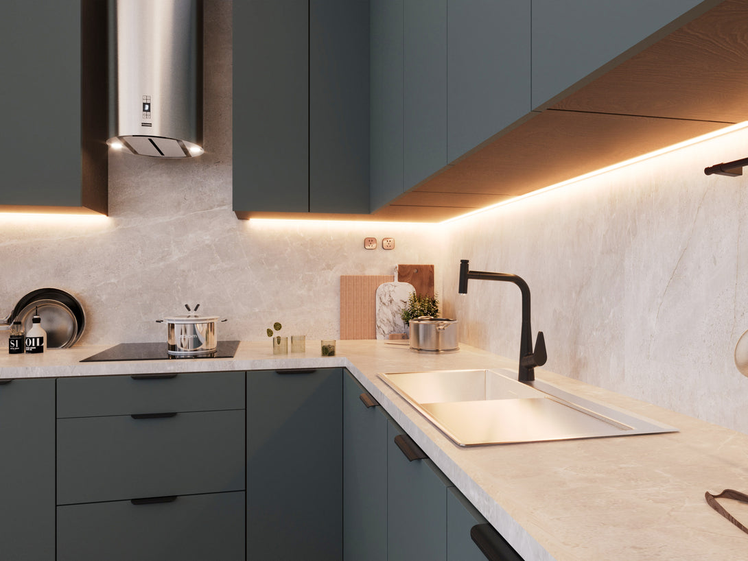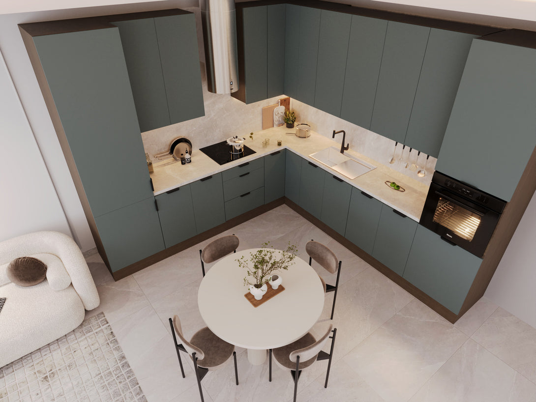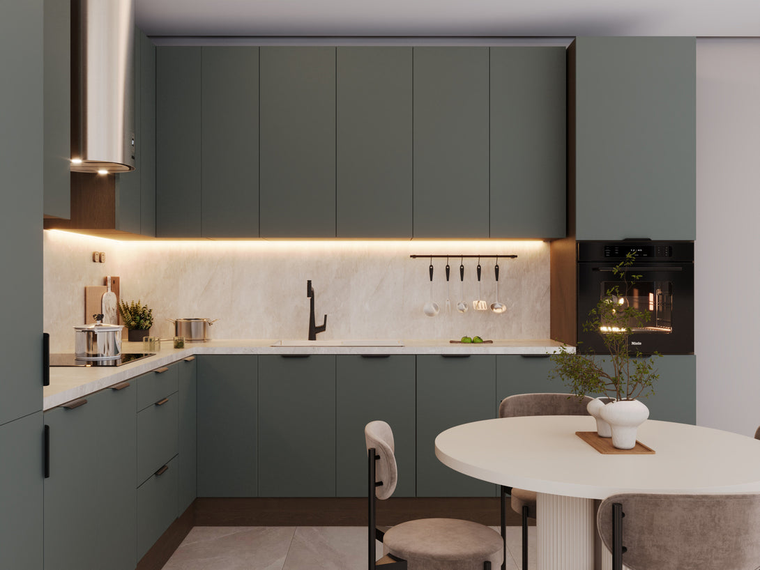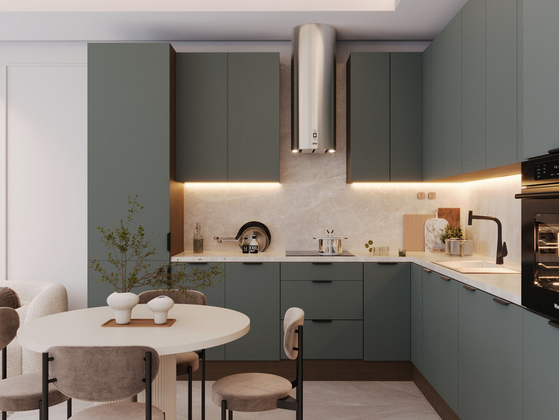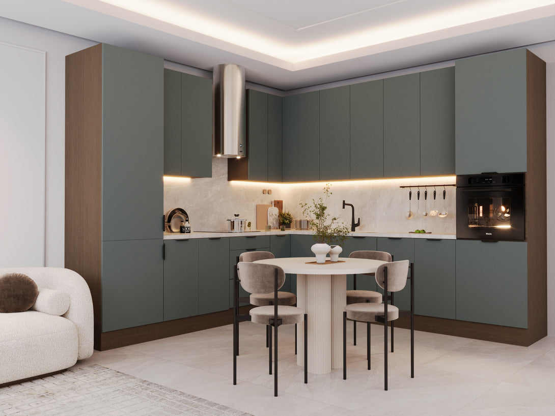 Die Livaro Küchenzeile KU-S34 präsentiert sich in modernen grünen Fronten mit einem warmen Dunkle-Eiche-Korpus, wodurch ein harmonisches und elegantes Gesamtbild entsteht. Die großzügige L-Form bietet optimale Stauraumlösungen, klare Funktionswege und maximale Übersichtlichkeit. Die Aluminium Griffleiste Schwarz setzt dabei einen modernen, markanten Akzent und verleiht der Küche hochwertige visuelle Tiefe – ideal für anspruchsvolle Wohnumgebungen.