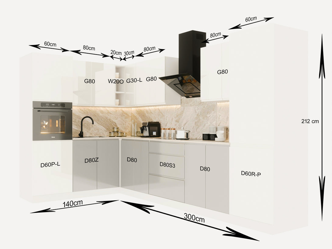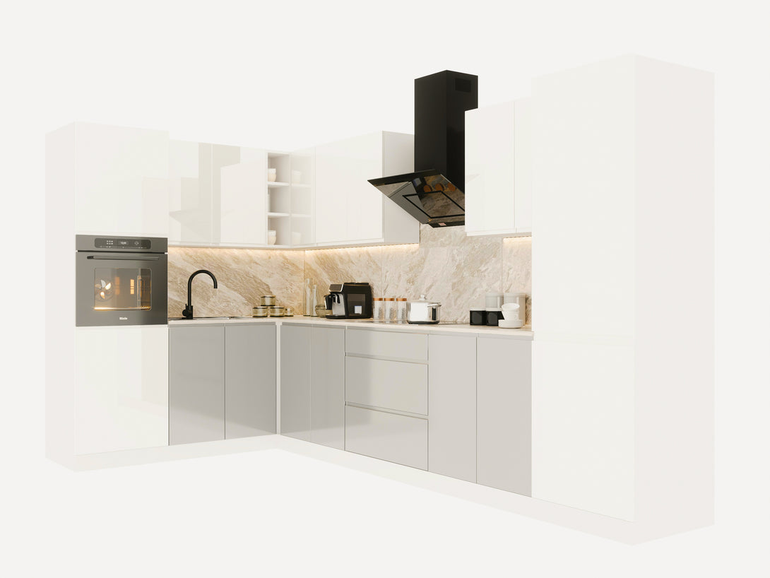 L-Küche – Winkelküche – Eckküche Glanzia 300x140 cm – Hochglanz Weiß / Grau