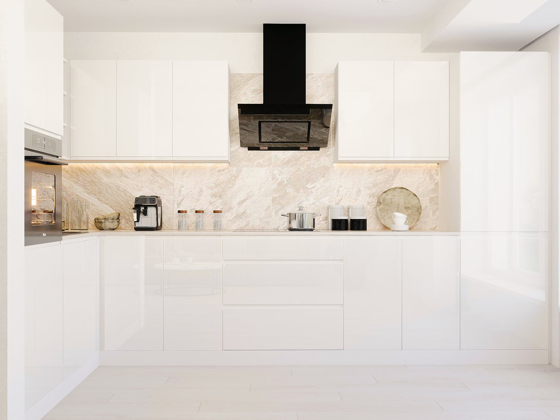 L-Küche – Winkelküche – Eckküche 300x140 cm Glanzia – KU-S10 – Weiß – Hochglanz Ohne Arbeitsplatte & Elektrogeräte