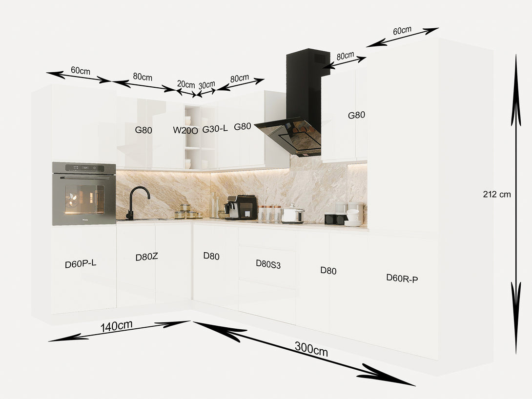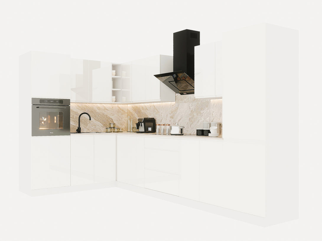 L-Küche – Winkelküche – Eckküche Glanzia 300x140 cm – Hochglanz Weiß