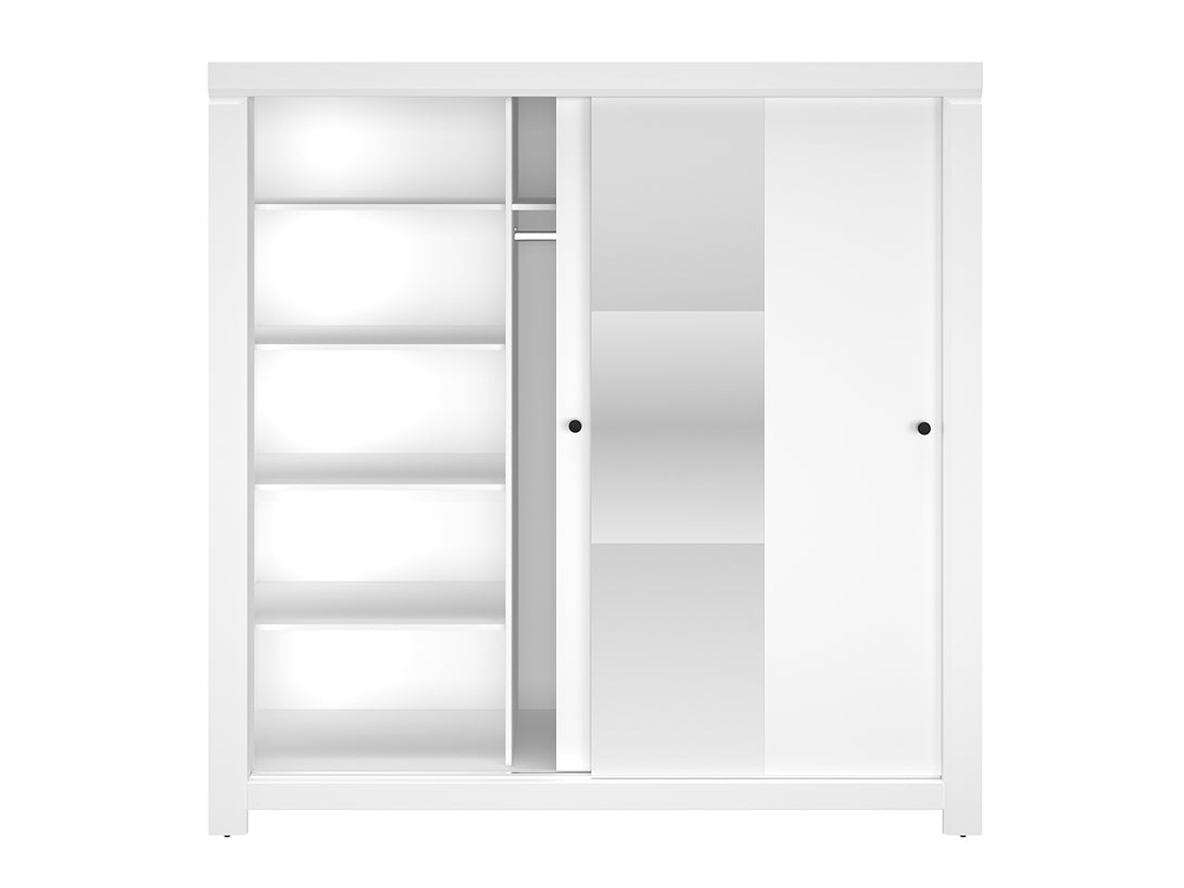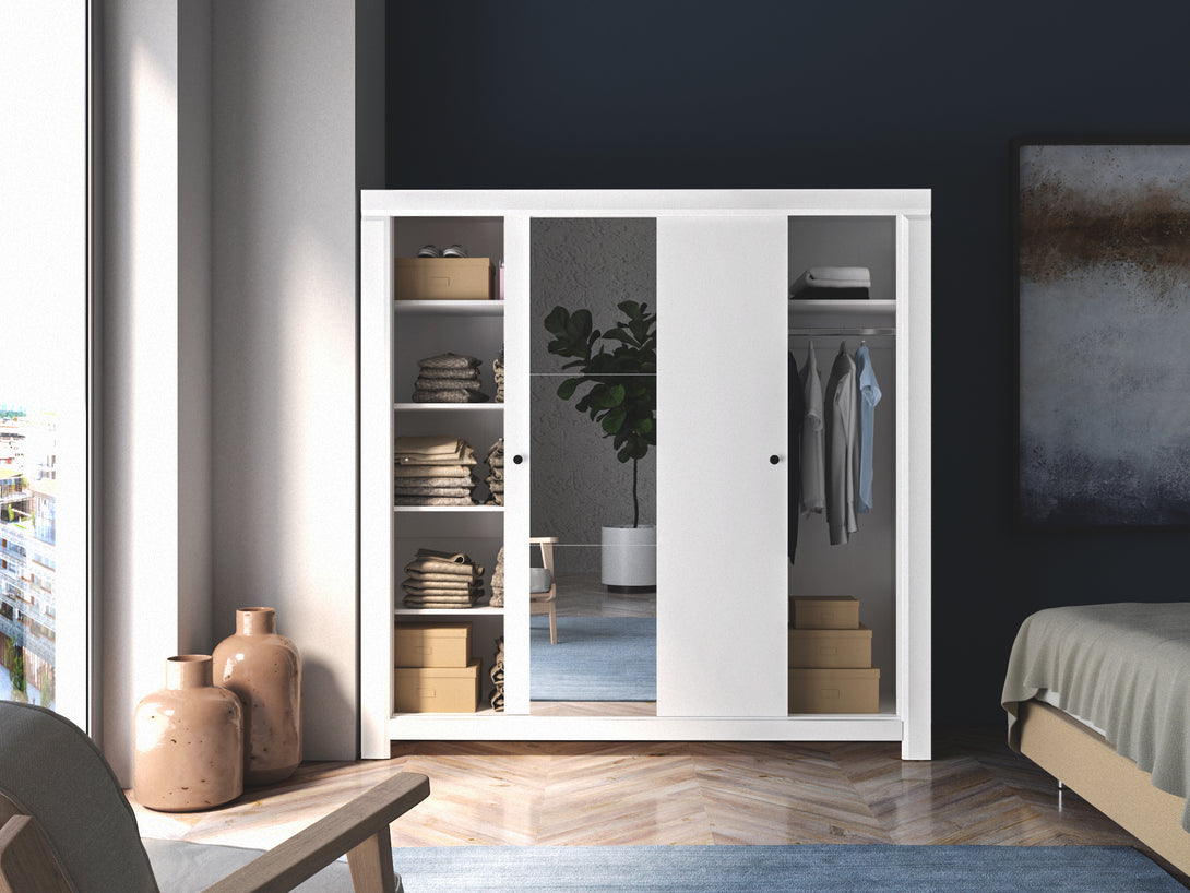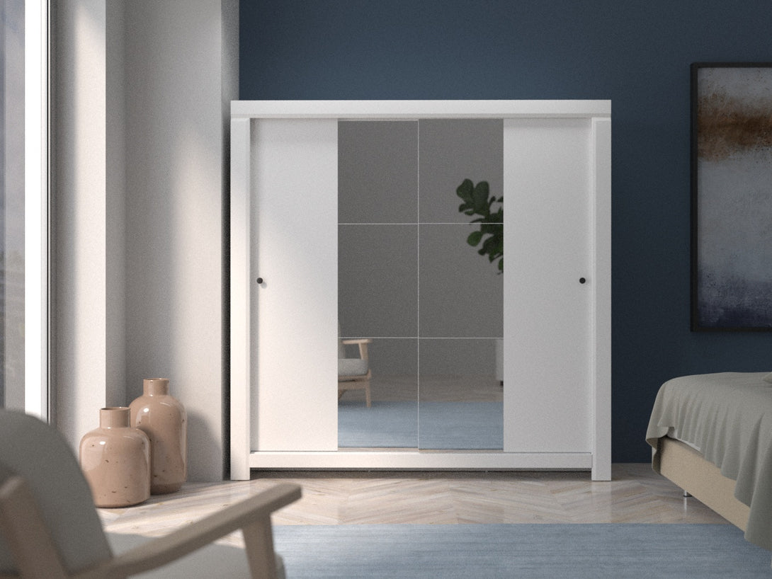 Der LAHTI 01 Kleiderschrank bietet eine elegante Kombination aus Funktionalität und modernem Design. Mit seinem großzügigen Maß von 200 cm Breite und einem praktischen Schwebetürsystem mit Glasanteilen ist er die perfekte Lösung für stilvolle Schlafzimmer.