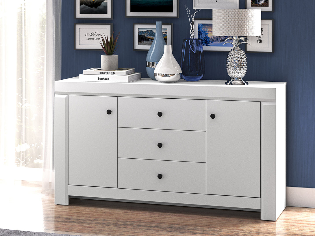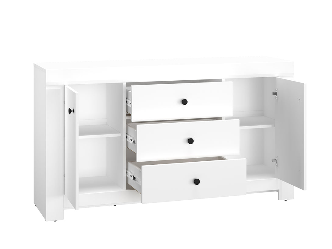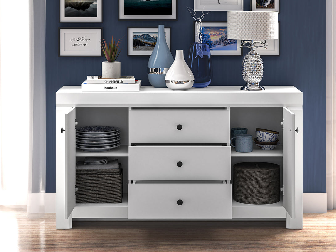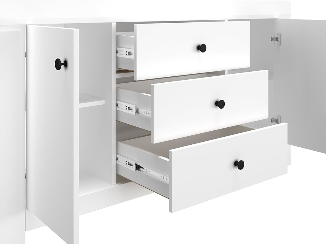 Die LAHTI 09 Kommode überzeugt durch ihre moderne Linienführung, praktische Aufteilung und hochwertige Verarbeitung. Die weiße matte MDF-Front verleiht ihr ein elegantes und zeitloses Aussehen, das sich nahtlos in moderne Wohnräume einfügt. Mit großzügigem Stauraum und funktionalen Schubladen eignet sie sich ideal als Sideboard im Wohn- oder Schlafzimmer.