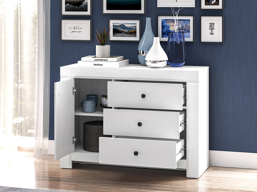 Die LAHTI 10 Kommode überzeugt mit ihrer schlichten Eleganz, kompakten Form und praktischen Funktionalität. Die weiße matte MDF-Front verleiht ihr ein stilvolles Aussehen, das sich harmonisch in moderne Wohn- oder Schlafzimmer einfügt. Die klaren Linien und das grifflose Design betonen den minimalistischen Charakter der Möbelserie.