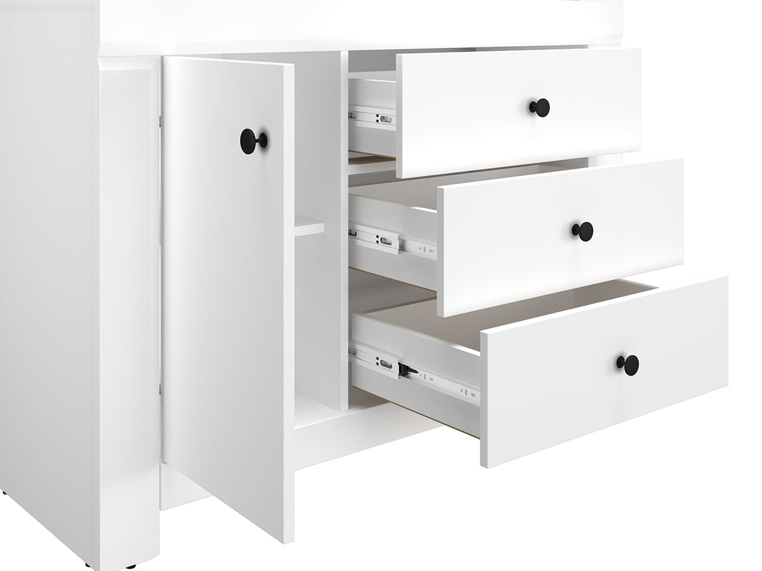 Ausgestattet mit Schubladen im Vollauszug, ABS-Kanten und Soft-Close-Technologie, bietet die Kommode eine komfortable Handhabung und lange Haltbarkeit. Die hochwertige Verarbeitung und die stabile Konstruktion garantieren eine zuverlässige Nutzung im Alltag.