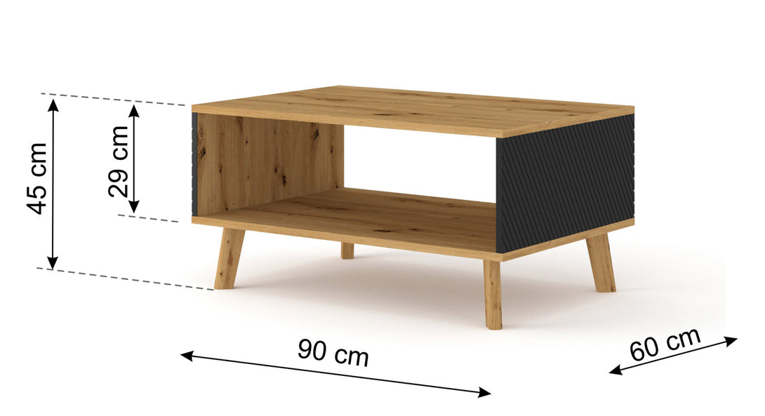 Der LUXI Couchtisch vereint industriellen Loft-Stil mit natürlichen Materialien. Die Kombination aus Artisan Eiche und mattem Schwarz sorgt für einen modernen, zeitlosen Look. Die charakteristischen schrägen Holzbeine verleihen dem Tisch ein besonderes Design.