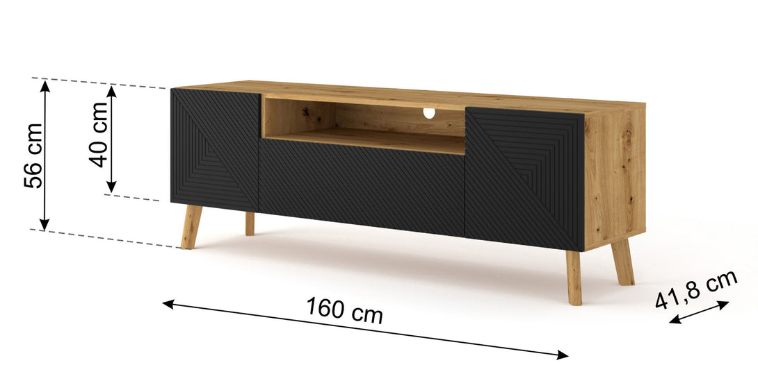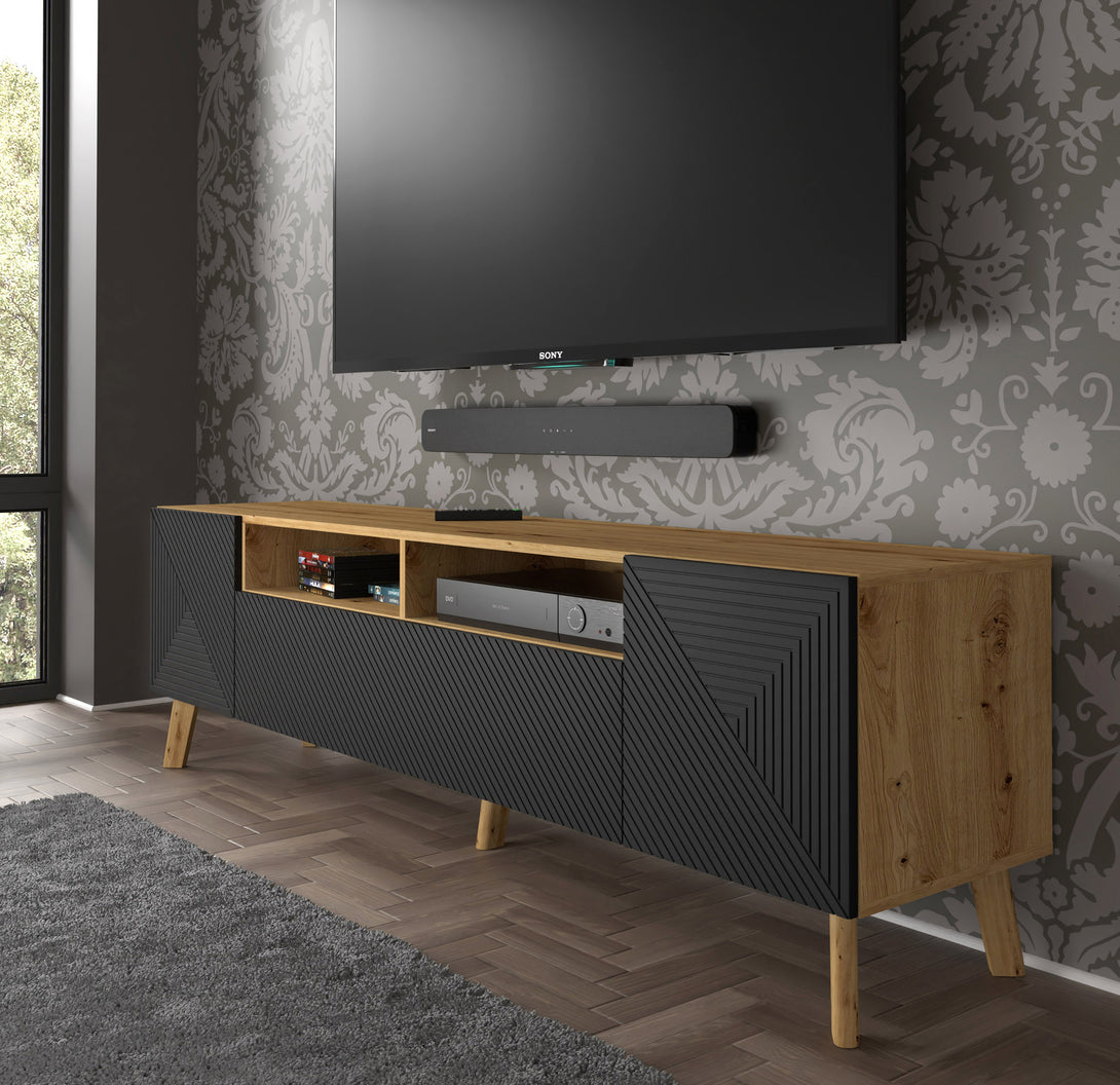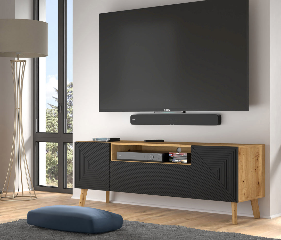 Das LUXI TV-Lowboard vereint industriellen Charakter mit stilvoller Eleganz und bietet die perfekte Ergänzung für moderne Wohnräume. Die Kombination aus Artisan-Eiche und mattem Schwarz sorgt für einen zeitlosen Look, während die schrägen Holzfüße das Design auflockern. Mit vier geschlossenen Fächern und zwei offenen Regalen bietet das Möbelstück ausreichend Stauraum für Technik, Zubehör oder Dekorationsartikel.