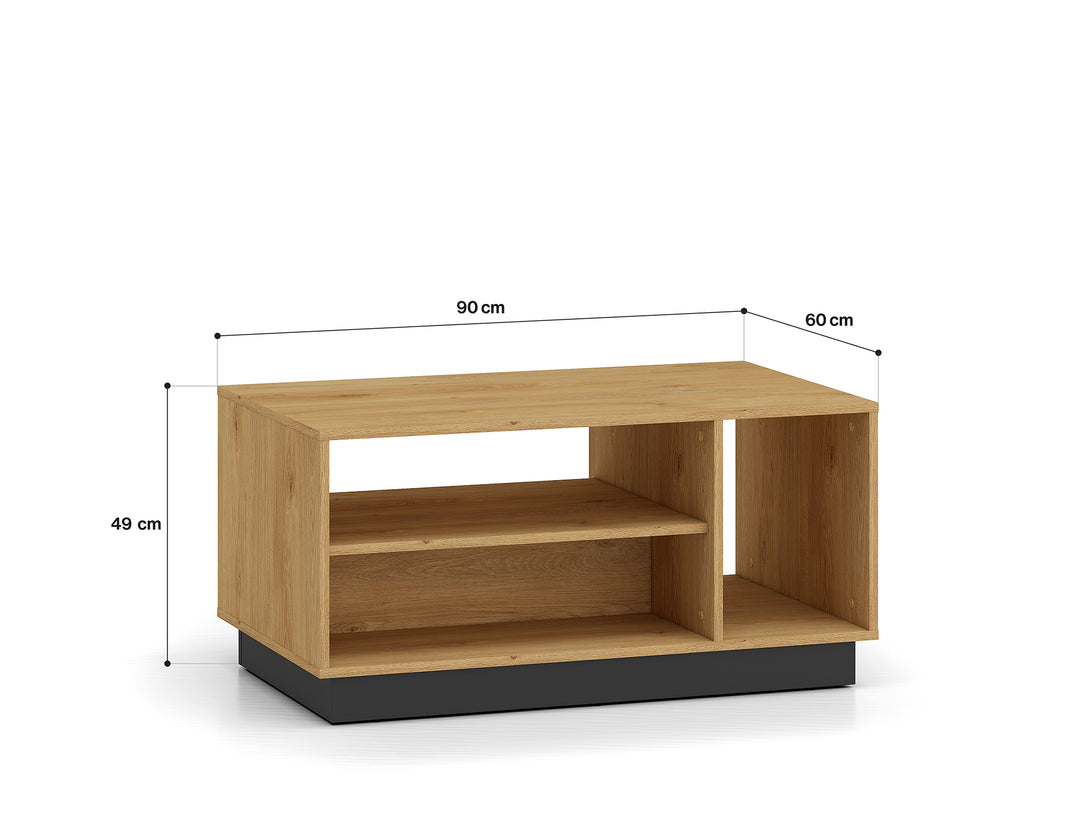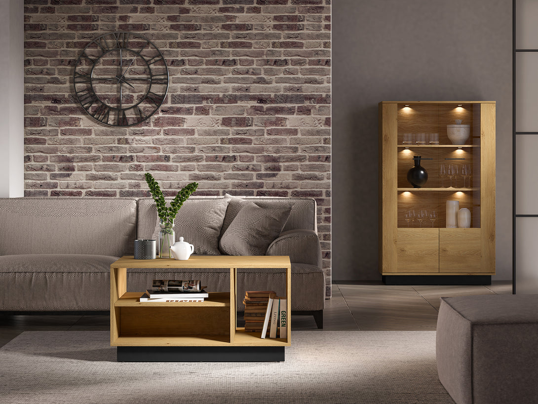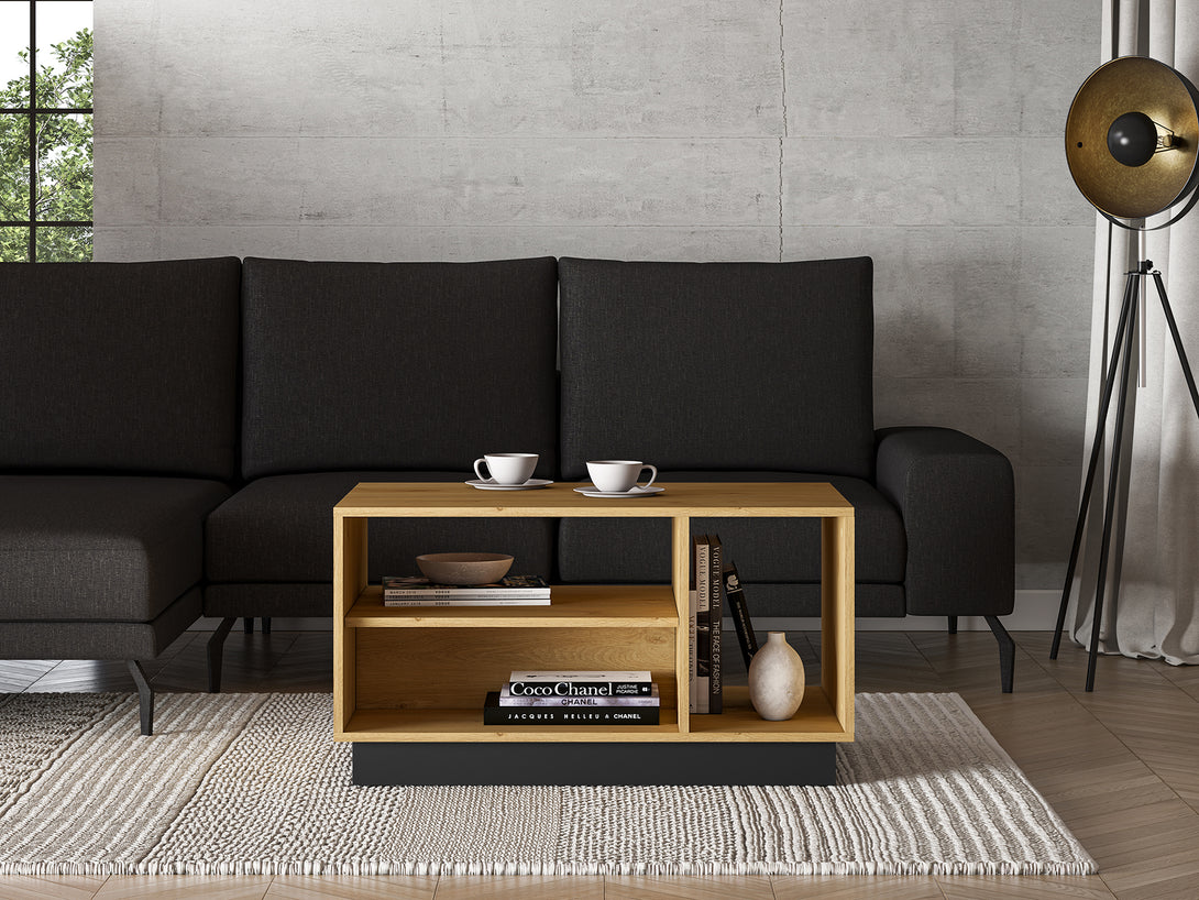 Der MODESTO 07 Couchtisch vereint modernes Design mit funktionalem Komfort. Mit seiner stilvollen Kombination aus natürlicher Holzoptik und schwarzem Untergestell passt er sich harmonisch in verschiedene Wohnkonzepte ein. Die kompakte Form bietet ausreichend Fläche für Getränke, Dekoration oder Magazine und unterstützt zugleich eine offene, luftige Raumgestaltung.