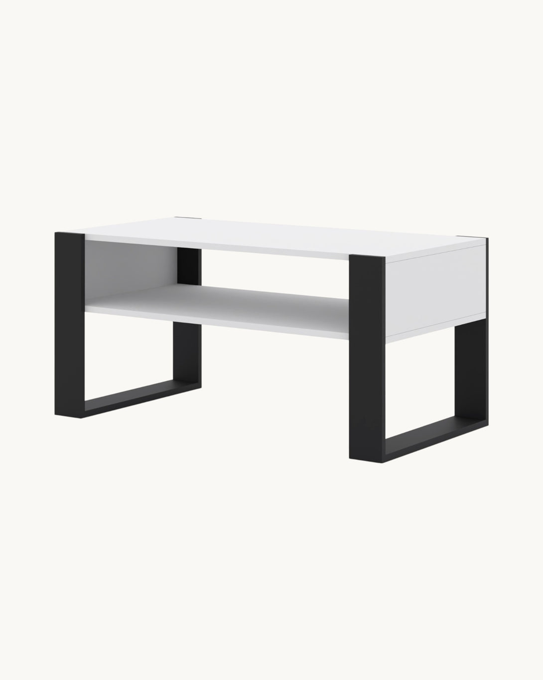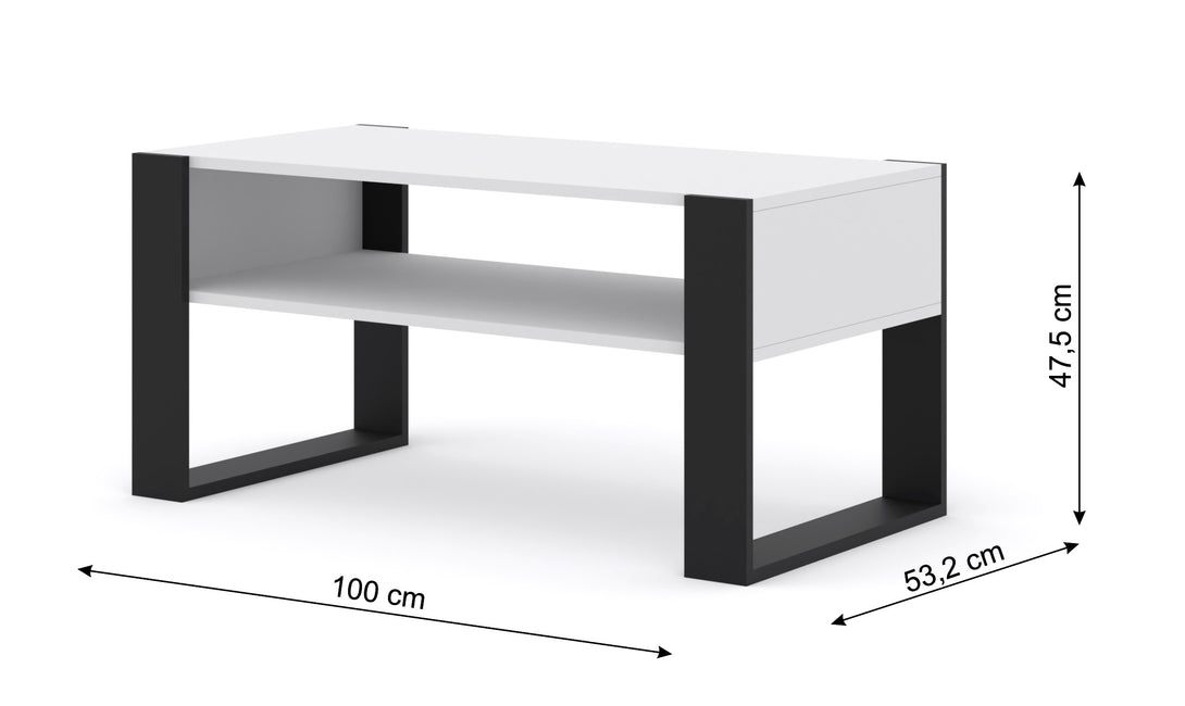 Der MONDI Couchtisch 100x50 überzeugt durch sein modernes, minimalistisches Design und seine funktionale Konstruktion. Die Kombination aus weiß matter Tischplatte und schwarzem Rahmen verleiht dem Tisch einen eleganten, kontrastreichen Look – ideal für zeitgemäße Wohnräume.