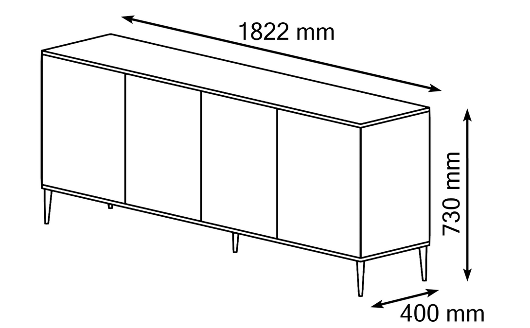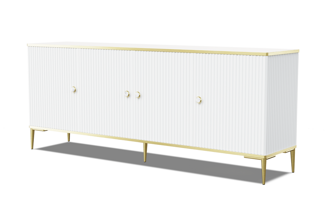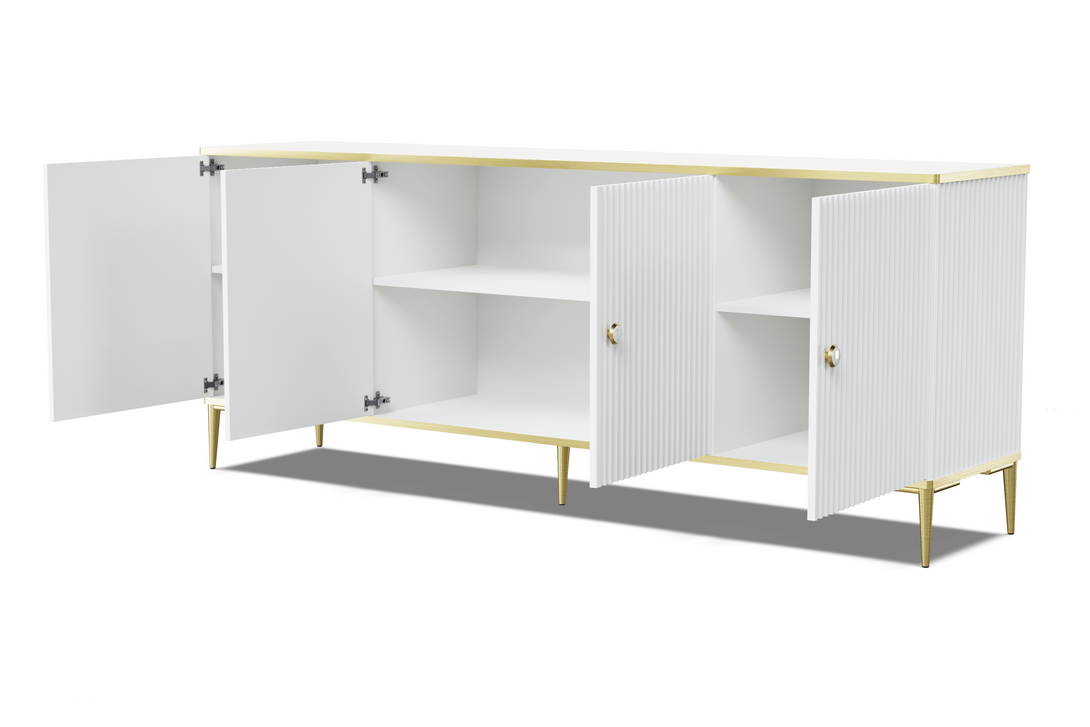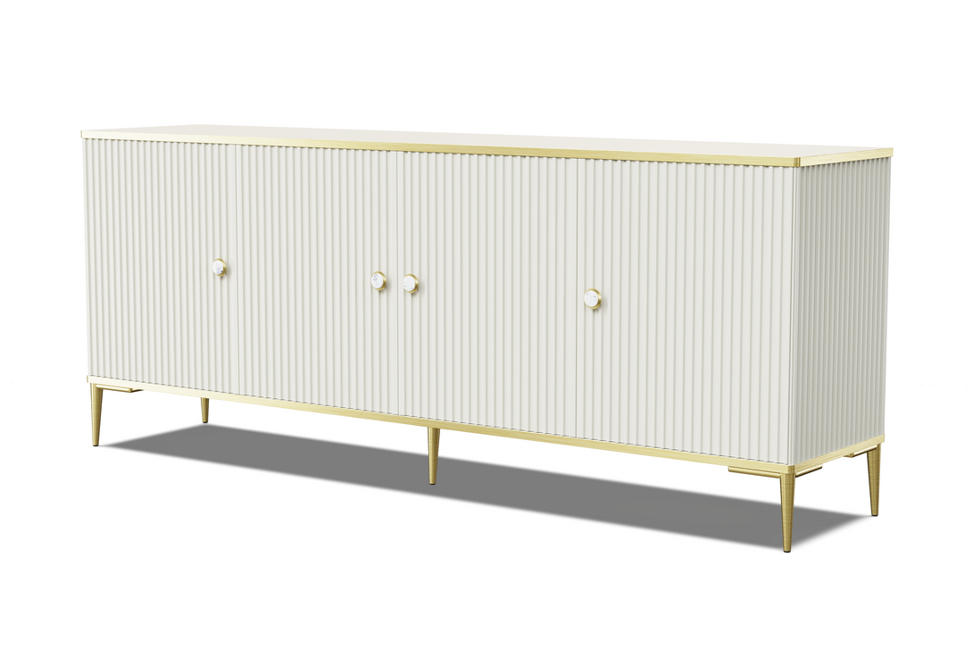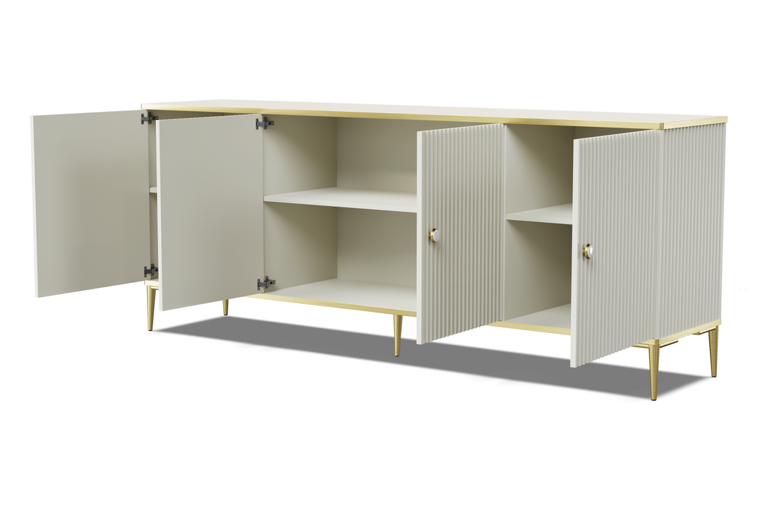 Die PETRA Kommode vereint stilvolle Ästhetik mit durchdachter Funktionalität und eignet sich perfekt für moderne Wohnkonzepte. Ihre vier Türen mit gefrästen MDF-Fronten schaffen eine harmonische Struktur, während die goldfarbenen Metallfüße und eleganten Griffe dem Möbelstück eine edle Note verleihen. Die Farbgebung in dezentem Cashmere-Ton bringt Wärme und Raffinesse in jeden Raum.