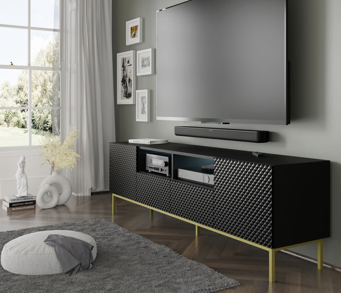 Das RAVENNA CK TV Lowboard überzeugt durch sein exklusives Design mit diamantgefrästen Hochglanzfronten in Schwarz und einem goldfarbenen Metallrahmen. Es vereint modernes, griffloses Erscheinungsbild mit hoher Funktionalität – ideal für stilvolle Wohnzimmer. Der stabile Metallrahmen sorgt für sicheren Stand und verleiht dem Möbelstück eine edle Note.