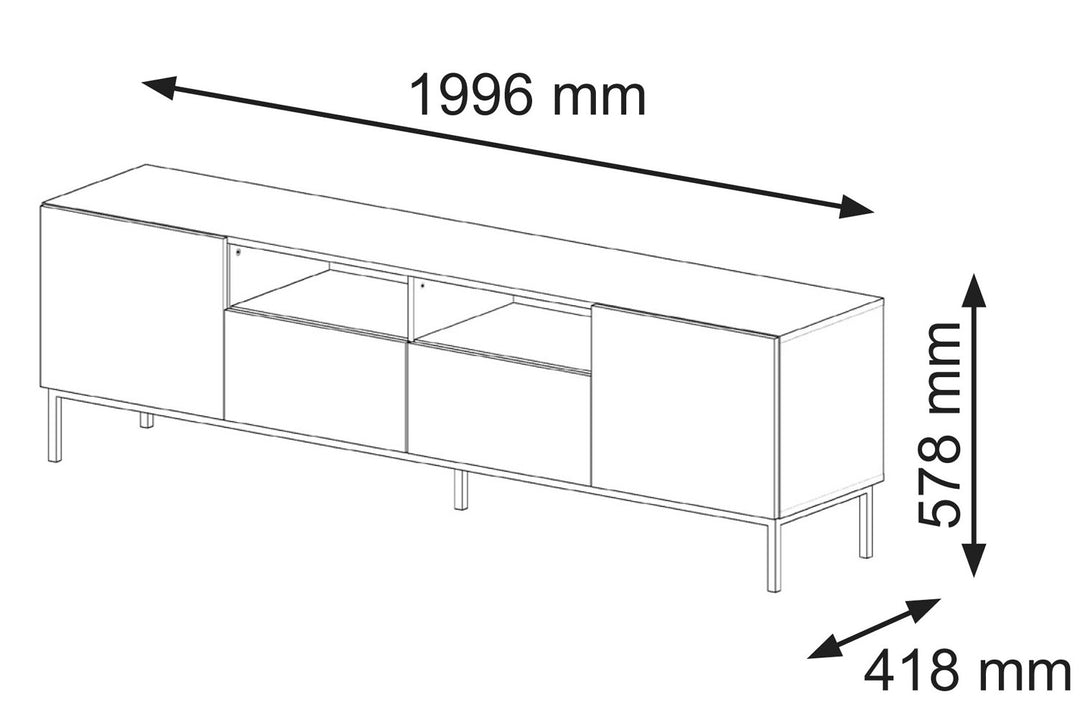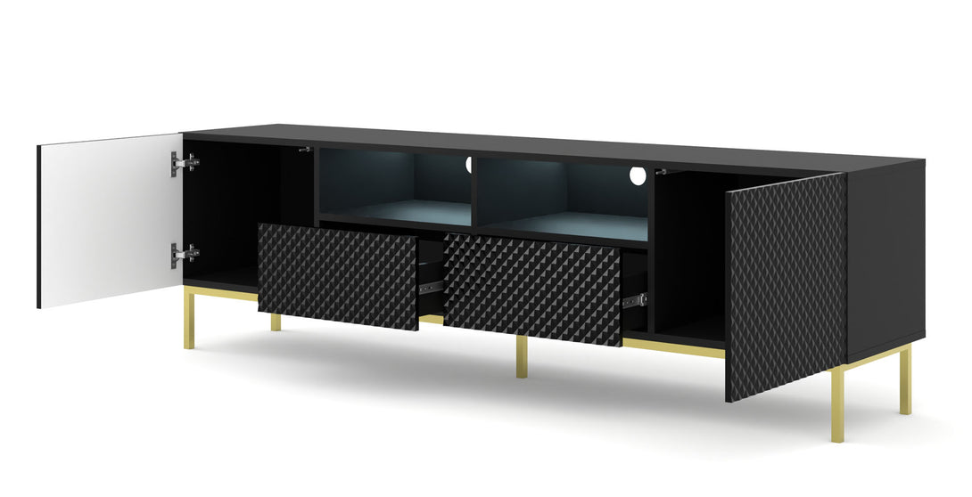 Mit zwei Schränken, zwei Schubladen und zwei offenen Fächern bietet das Lowboard großzügigen Stauraum für Multimedia-Geräte und Zubehör. Die integrierte LED-Beleuchtung unterstreicht das hochwertige Erscheinungsbild. Die Push-to-Open-Mechanik rundet das moderne Konzept perfekt ab.