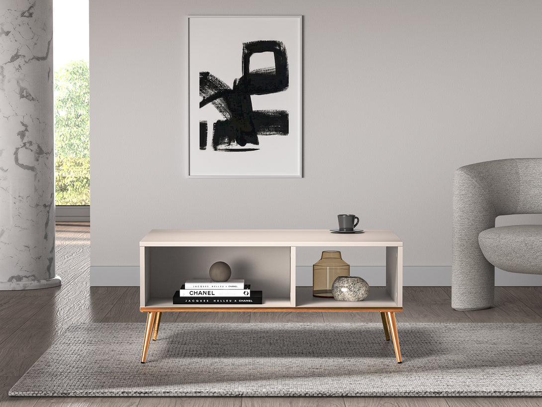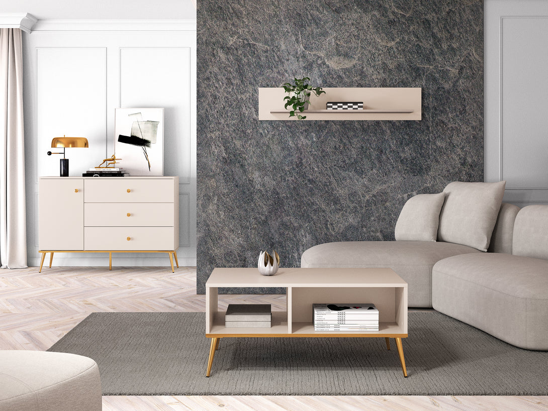 Der Selgin 07 Couchtisch ist das perfekte Möbelstück für Ihr Wohnzimmer. Zentral im Raum platziert, wird er schnell zum unverzichtbaren Element Ihrer Einrichtung. Stellen Sie Ihre Kaffeetasse ab, legen Sie die aktuelle Zeitung ab oder haben Sie die Fernbedienung immer griffbereit. Die großzügige Tischplatte bietet Platz, um Ihre Lieblingsalben stilvoll zu präsentieren. Zwei geräumige Fächer unter der Platte sind ideal, um Bücher, Kerzen oder kleine Skulpturen aufzubewahren. Die Möbelstruktur steht auf stabilen, hohen Metallbeinen. Die doppelt galvanisierten Beine in goldener Optik garantieren eine langlebige und komfortable Nutzung. Möbel der Selgin-Kollektion verbinden hohe Funktionalität mit beeindruckendem Design.