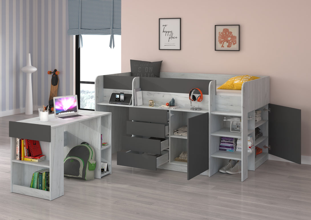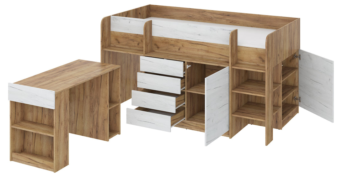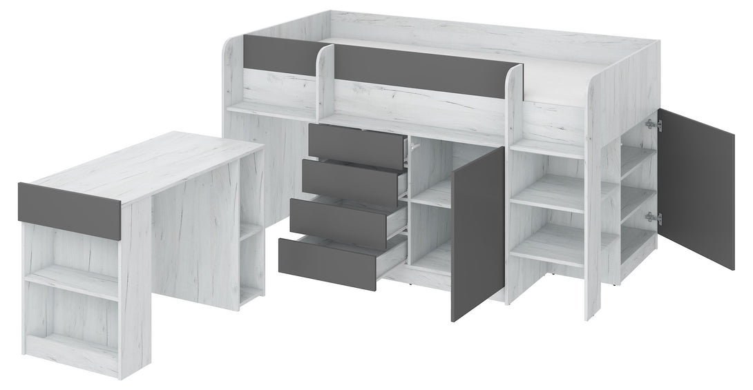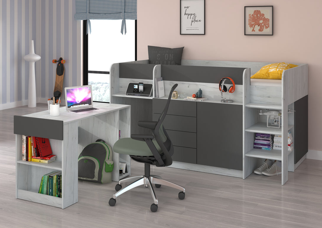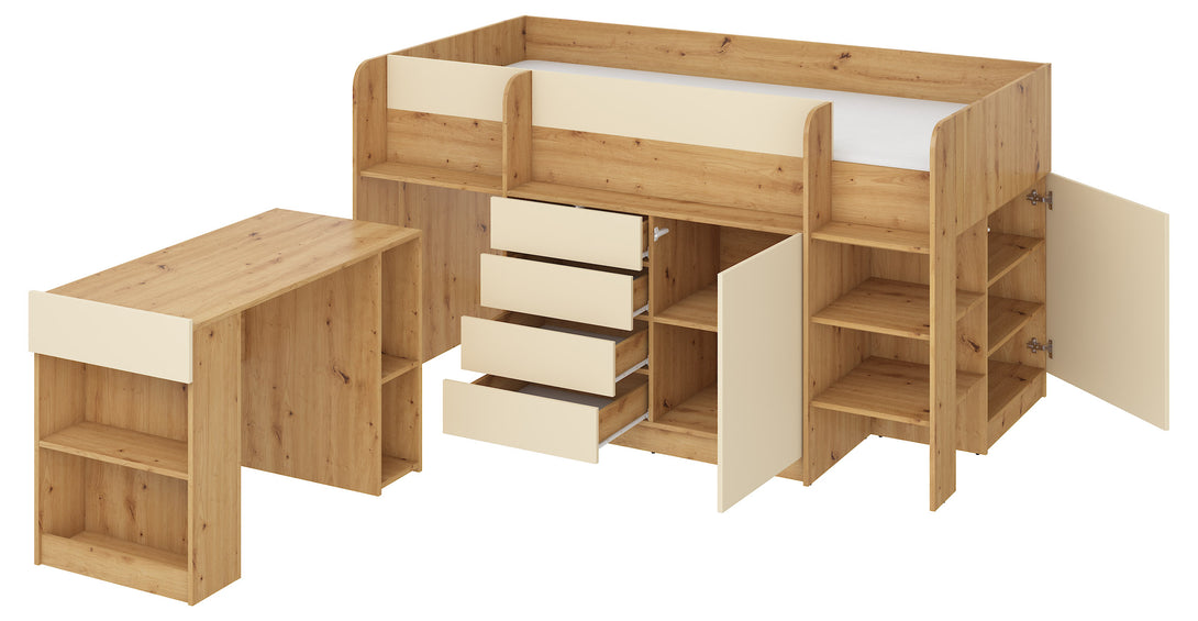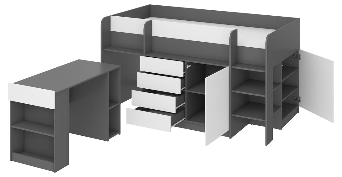 Hergestellt aus hochwertigen Materialien, überzeugt das Möbelstück durch seine stabile Konstruktion und moderne Form. Die ruhigen Schließmechanismen und die durchdachte Raumaufteilung schaffen eine angenehme Umgebung zum Lernen und Entspannen. Mit der originalen Formgebung bringt das Bett nicht nur Struktur, sondern auch Freude in den Alltag Ihres Kindes.