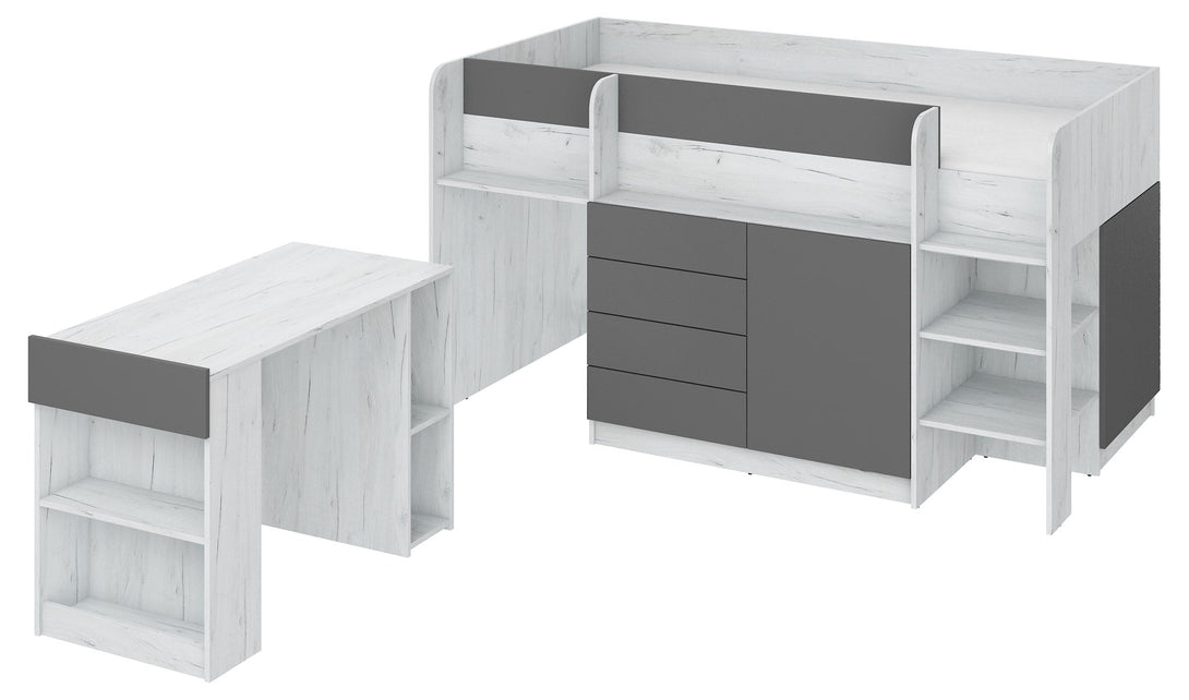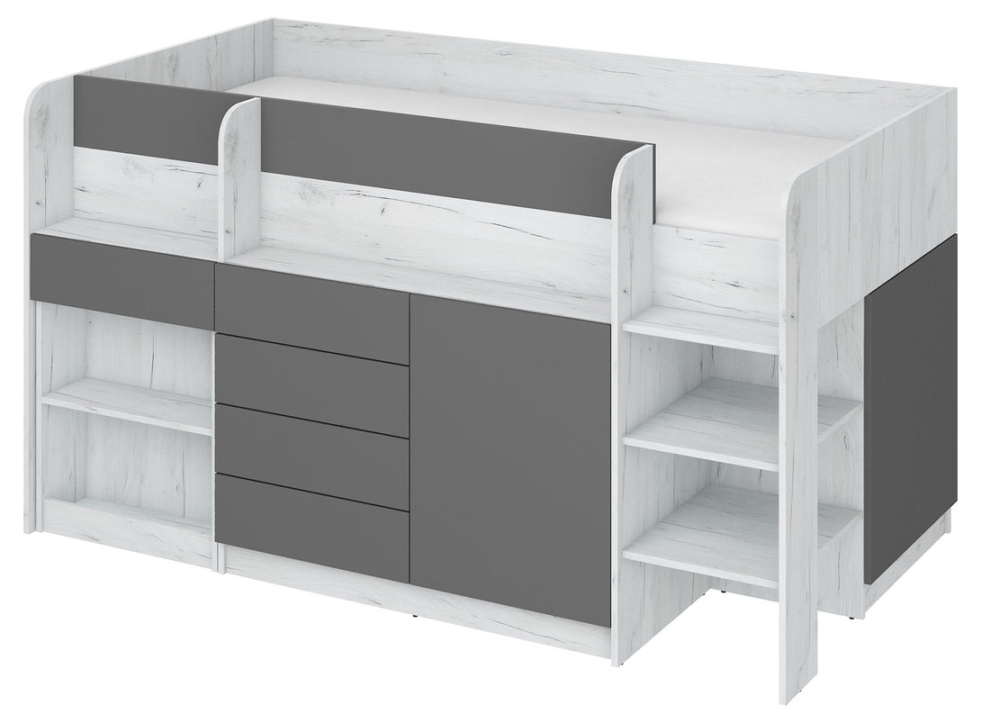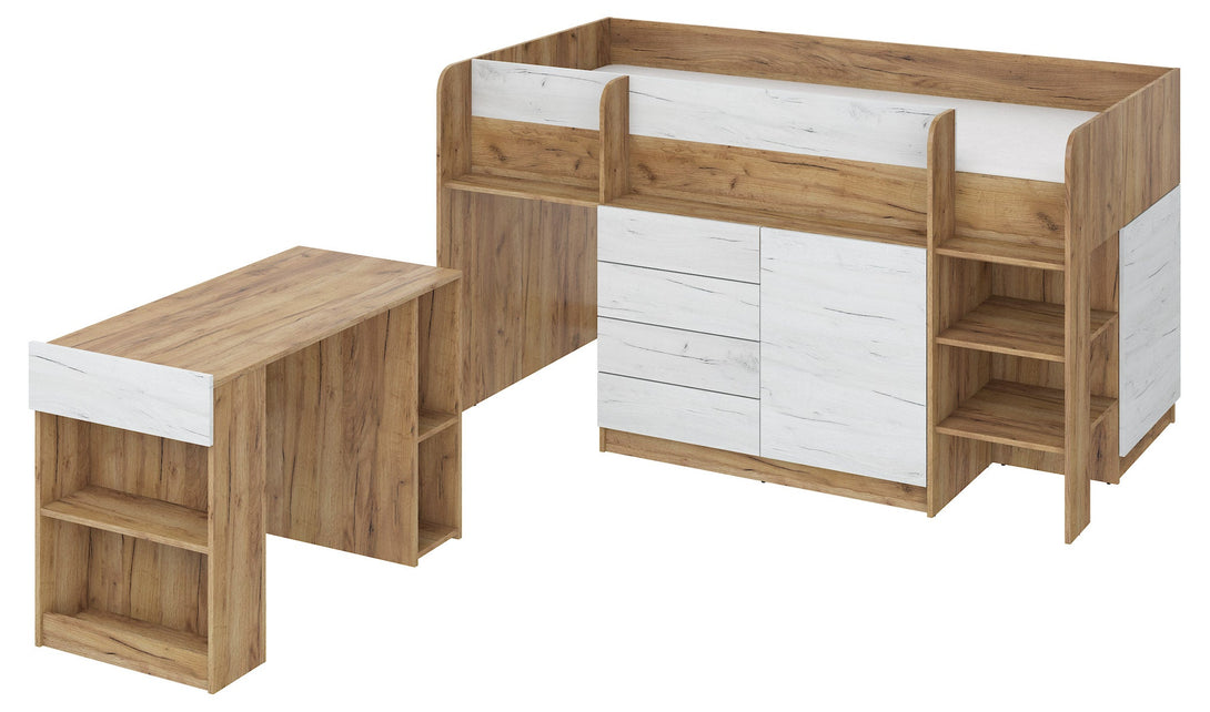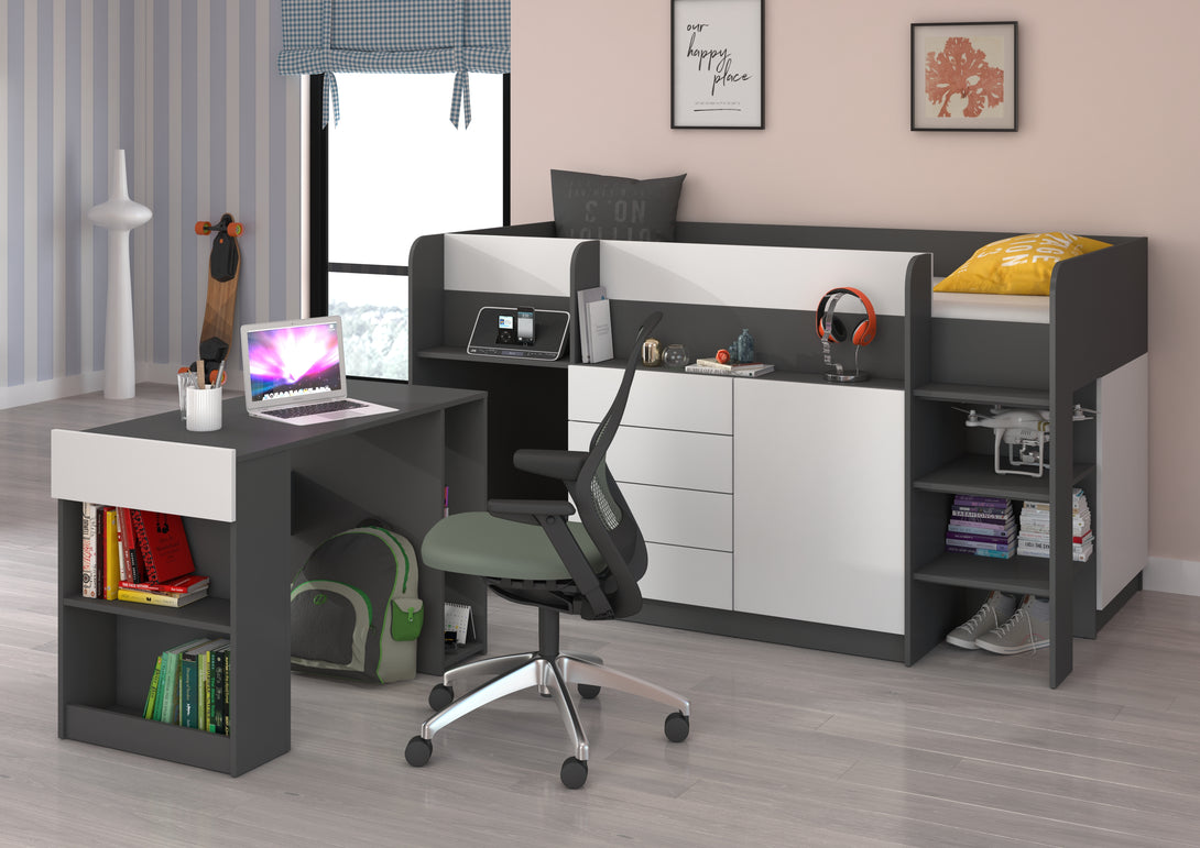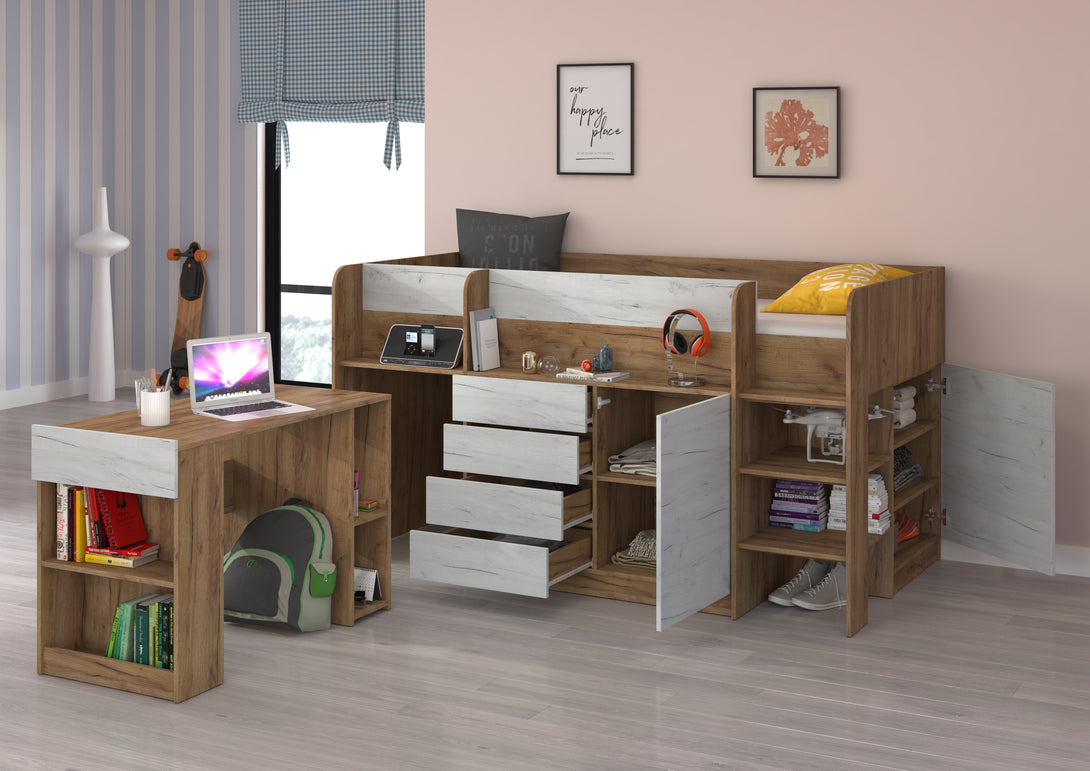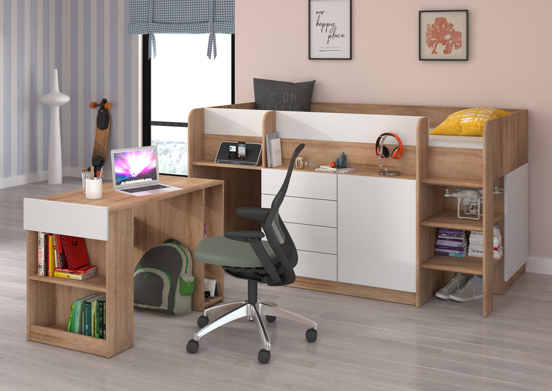 Hergestellt aus hochwertigen Materialien, überzeugt das Möbelstück durch seine stabile Konstruktion und moderne Form. Die ruhigen Schließmechanismen und die durchdachte Raumaufteilung schaffen eine angenehme Umgebung zum Lernen und Entspannen. Mit der originalen Formgebung bringt das Bett nicht nur Struktur, sondern auch Freude in den Alltag Ihres Kindes.